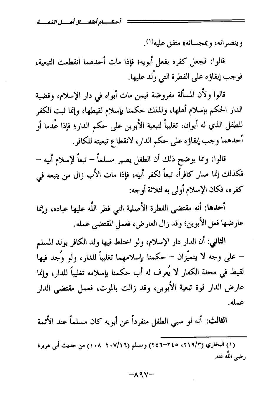 قَالُوا: وَلِأَنَّ الْمَسْأَلَةَ مَفْرُوضَةٌ فِيمَنْ مَاتَ أَبَوَاهُ فِي دَارِ الْإِسْلَامِ، وَقَضِيَّةُ الدَّارِ الْحُكْمُ بِإِسْلَامِ أَهْلِهَا، وَلِذَلِكَ حَكَمْنَا بِإِسْلَامِ لَقِيطِهَا، وَإِنَّمَا ثَبَتَ الْكُفْرُ لِلطِّفْلِ الَّذِي لَهُ أَبَوَانِ، تَغْلِيبًا لِتَبَعِيَّةِ الْأَبَوَيْنِ عَلَى حُكْمِ الدَّارِ، فَإِذَا عُدِمَا، أَوْ أَحَدُهُمَا وَجَبَ إِبْقَاؤُهُ عَلَى حُكْمِ الدَّارِ، لِانْقِطَاعِ تَبَعِيَّتِهِ لِلْكَافِرِ.