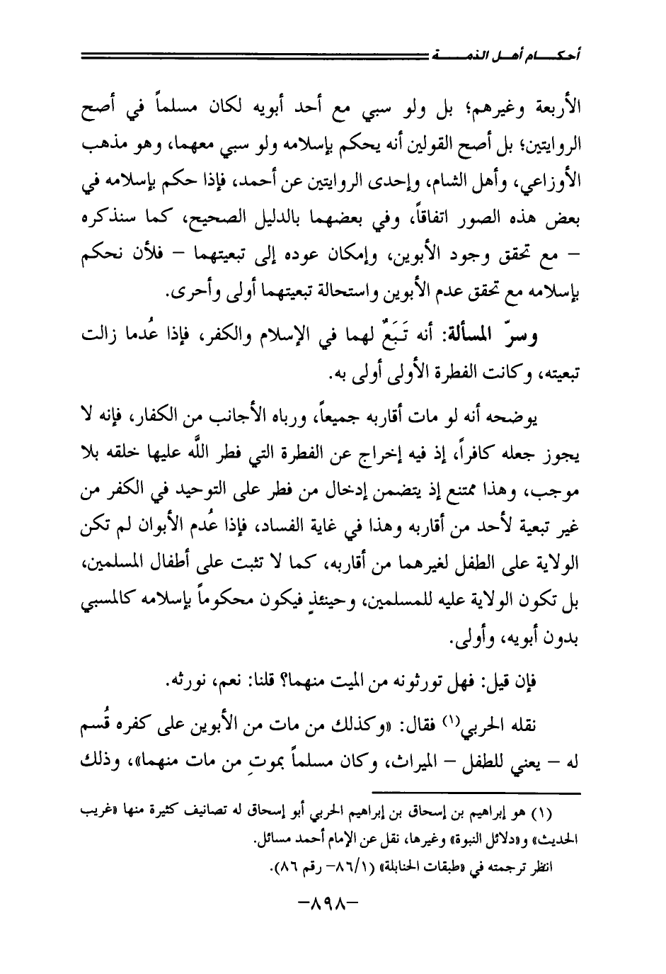 الْأَرْبَعَةِ، وَغَيْرِهِمْ، بَلْ وَلَوْ سُبِيَ مَعَ أَحَدِ أَبَوَيْهِ لَكَانَ مُسْلِمًا فِي أَصَحِّ الرِّوَايَتَيْنِ، بَلْ أَصَحُّ الْقَوْلَيْنِ أَنَّهُ يُحْكَمُ بِإِسْلَامِهِ، وَلَوْ سُبِيَ مَعَهُمَا، وَهُوَ مَذْهَبُ الْأَوْزَاعِيِّ، وَأَهْلِ الشَّامِ، وَإِحْدَى الرِّوَايَتَيْنِ عَنْ أَحْمَدَ، فَإِذَا حُكِمَ بِإِسْلَامِهِ فِي بَعْضِ هَذِهِ الصُّوَرِ اتِّفَاقًا، وَفِي بَعْضِهِمَا بِالدَّلِيلِ الصَّحِيحِ، كَمَا سَنَذْكُرُهُ - مَعَ تَحَقُّقِ وُجُودِ الْأَبَوَيْنِ، وَإِمْكَانِ عَوْدِهِ إِلَى تَبَعِيَّتِهِمَا - فَلَأَنْ نَحْكُمُ بِإِسْلَامِهِ مَعَ تَحَقُّقِ عَدَمِ الْأَبَوَيْنِ، وَاسْتِحَالَةُ تَبَعِيَّتِهِمَا أَوْلَى وَأَحْرَى.
