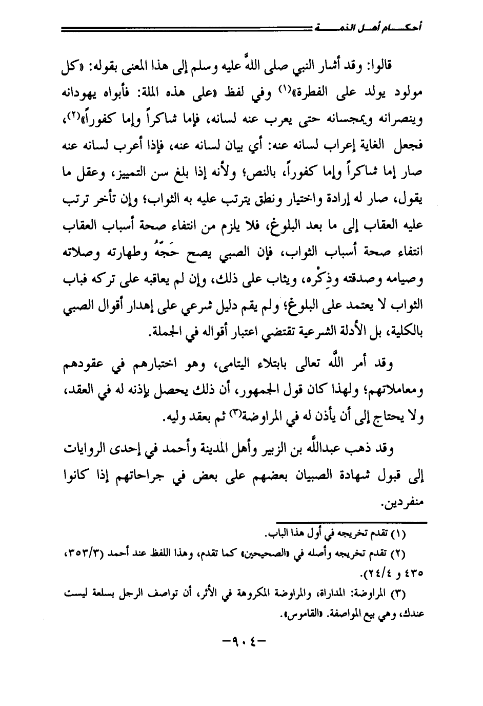 قَالُوا: وَقَدْ أَشَارَ النَّبِيُّ - صَلَّى اللَّهُ عَلَيْهِ وَسَلَّمَ - إِلَى هَذَا الْمَعْنَى بِقَوْلِهِ: " «كُلُّ مَوْلُودٍ يُولَدُ عَلَى الْفِطْرَةِ» " وَفِي لَفْظٍ " «عَلَى هَذِهِ الْمِلَّةِ: فَأَبَوَاهُ يُهَوِّدَانِهِ، وَيُنَصِّرَانِهِ، وَيُمَجِّسَانِهِ حَتَّى يُعْرِبَ عَنْهُ لِسَانُهُ، فَإِمَّا شَاكِرًا وَإِمَّا كَفُورًا» "، فَجَعَلَ الْغَايَةَ إِعْرَابَ لِسَانِهِ عَنْهُ: أَيْ بَيَانَ لِسَانِهِ عَنْهُ، فَإِذَا أَعْرَبَ لِسَانُهُ عَنْهُ صَارَ إِمَّا شَاكِرًا، وَإِمَّا كَفُورًا بِالنَّصِّ، وَلِأَنَّهُ إِذَا بَلَغَ سِنَّ التَّمْيِيزِ، وَعَقَلَ مَا يَقُولُ، صَارَ لَهُ إِرَادَةٌ، وَاخْتِيَارٌ، وَنُطْقٌ يَتَرَتَّبُ عَلَيْهِ بِهِ الثَّوَابُ، وَإِنْ تَأَخَّرَ تَرَتَّبَ عَلَيْهِ الْعِقَابُ إِلَى مَا بَعْدَ الْبُلُوغِ، فَلَا يَلْزَمُ مِنِ انْتِفَاءِ صِحَّةِ أَسْبَابِ الْعِقَابِ انْتِفَاءُ صِحَّةِ أَسْبَابِ الثَّوَابِ، فَإِنَّ الصَّبِيَّ يَصِحُّ حَجُّهُ، وَطَهَارَتُهُ، وَصَلَاتُهُ، وَصِيَامُهُ، وَصَدَقَتُهُ، وَذِكْرُهُ، وَيُثَابُ عَلَى ذَلِكَ، وَإِنْ لَمْ يُعَاقِبْهُ عَلَى تَرْكِهِ فَبَابُ الثَّوَابِ لَا يَعْتَمِدُ عَلَى الْبُلُوغِ، وَلَمْ يَقُمْ دَلِيلٌ شَرْعِيٌّ عَلَى إِهْدَارِ أَقْوَالِ الصَّبِيِّ بِالْكُلِّيَّةِ، بَلِ الْأَدِلَّةُ الشَّرْعِيَّةُ تَقْتَضِي اعْتِبَارَ أَقْوَالِهِ فِي الْجُمْلَةِ.