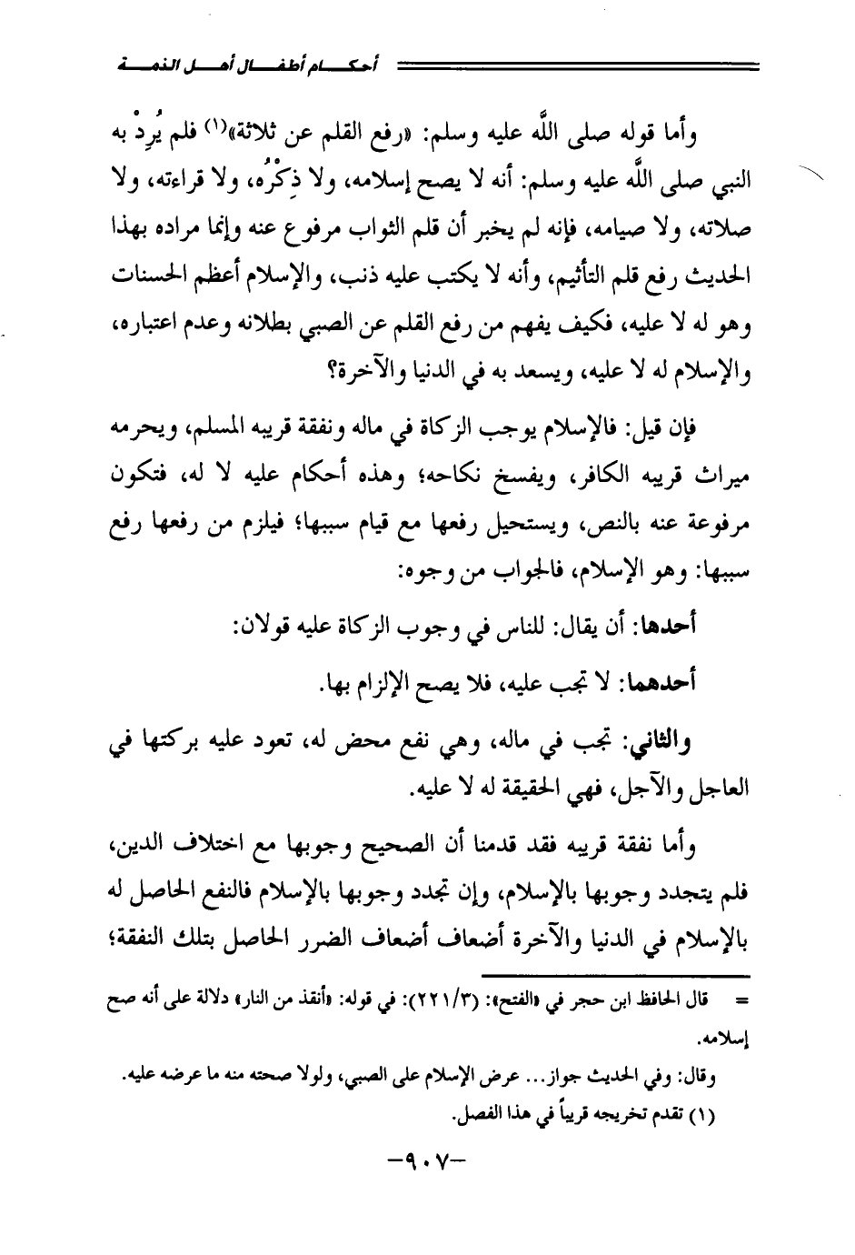 وَأَمَّا قَوْلُهُ - صَلَّى اللَّهُ عَلَيْهِ وَسَلَّمَ -: " «رُفِعَ الْقَلَمُ عَنْ ثَلَاثَةٍ» " فَلَمْ يَرُدَّ بِهِ النَّبِيُّ - صَلَّى اللَّهُ عَلَيْهِ وَسَلَّمَ -: أَنَّهُ لَا يَصِحُّ إِسْلَامُهُ، وَلَا ذِكْرُهُ، وَلَا قِرَاءَتُهُ، وَلَا صَلَاتُهُ، وَلَا صِيَامُهُ، فَإِنَّهُ لَمْ يُخْبِرْ أَنَّ قَلَمَ الثَّوَابِ مَرْفُوعٌ عَنْهُ، وَإِنَّمَا مُرَادُهُ بِهَذَا الْحَدِيثِ رَفْعُ قَلَمِ التَّأْثِيمِ، وَأَنَّهُ لَا يُكْتَبُ عَلَيْهِ ذَنْبٌ، وَالْإِسْلَامُ أَعْظَمُ الْحَسَنَاتِ، وَهُوَ لَهُ لَا عَلَيْهِ، فَكَيْفَ يُفْهَمُ مِنْ رَفْعِ الْقَلَمِ عَنِ الصَّبِيِّ بُطْلَانُهُ، وَعَدَمُ اعْتِبَارِهِ، وَالْإِسْلَامُ لَهُ لَا عَلَيْهِ، وَيَسْعَدُ بِهِ فِي الدُّنْيَا وَالْآخِرَةِ؟