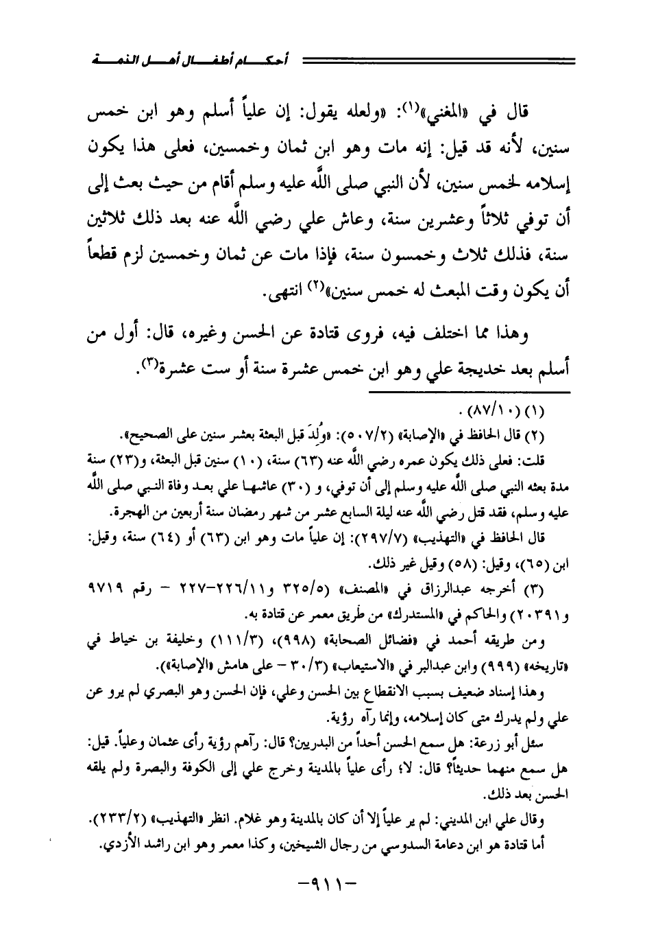 قَالَ فِي " الْمُغْنِي ": " وَلَعَلَّهُ يَقُولُ: إِنَّ عَلِيًّا أَسْلَمَ، وَهُوَ ابْنُ خَمْسِ سِنِينَ؛ لِأَنَّهُ قَدْ قِيلَ: إِنَّهُ مَاتَ وَهُوَ ابْنُ ثَمَانٍ وَخَمْسِينَ، فَعَلَى هَذَا يَكُونُ إِسْلَامُهُ لِخَمْسِ سِنِينَ؛ لِأَنَّ النَّبِيَّ - صَلَّى اللَّهُ عَلَيْهِ وَسَلَّمَ - أَقَامَ مِنْ حَيْثُ بُعِثَ إِلَى أَنْ تُوُفِّيَ ثَلَاثًا وَعِشْرِينَ سَنَةً، وَعَاشَ عَلِيٌّ - رَضِيَ اللَّهُ عَنْهُ - بَعْدَ ذَلِكَ ثَلَاثِينَ سَنَةً، فَذَلِكَ ثَلَاثٌ وَخَمْسُونَ سَنَةً، فَإِذَا مَاتَ عَنْ ثَمَانٍ وَخَمْسِينَ لَزِمَ قَطْعًا أَنْ يَكُونَ وَقْتَ الْمَبْعَثِ لَهُ خَمْسُ سِنِينَ " انْتَهَى.