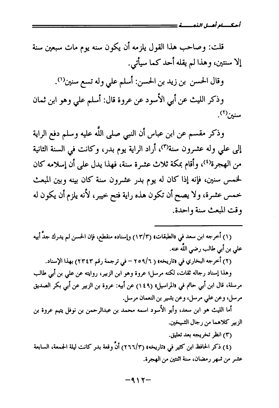 وَقَالَ الْحَسَنُ بْنُ زَيْدِ بْنِ الْحَسَنِ: أَسْلَمَ عَلِيٌّ، وَلَهُ تِسْعُ سِنِينَ.