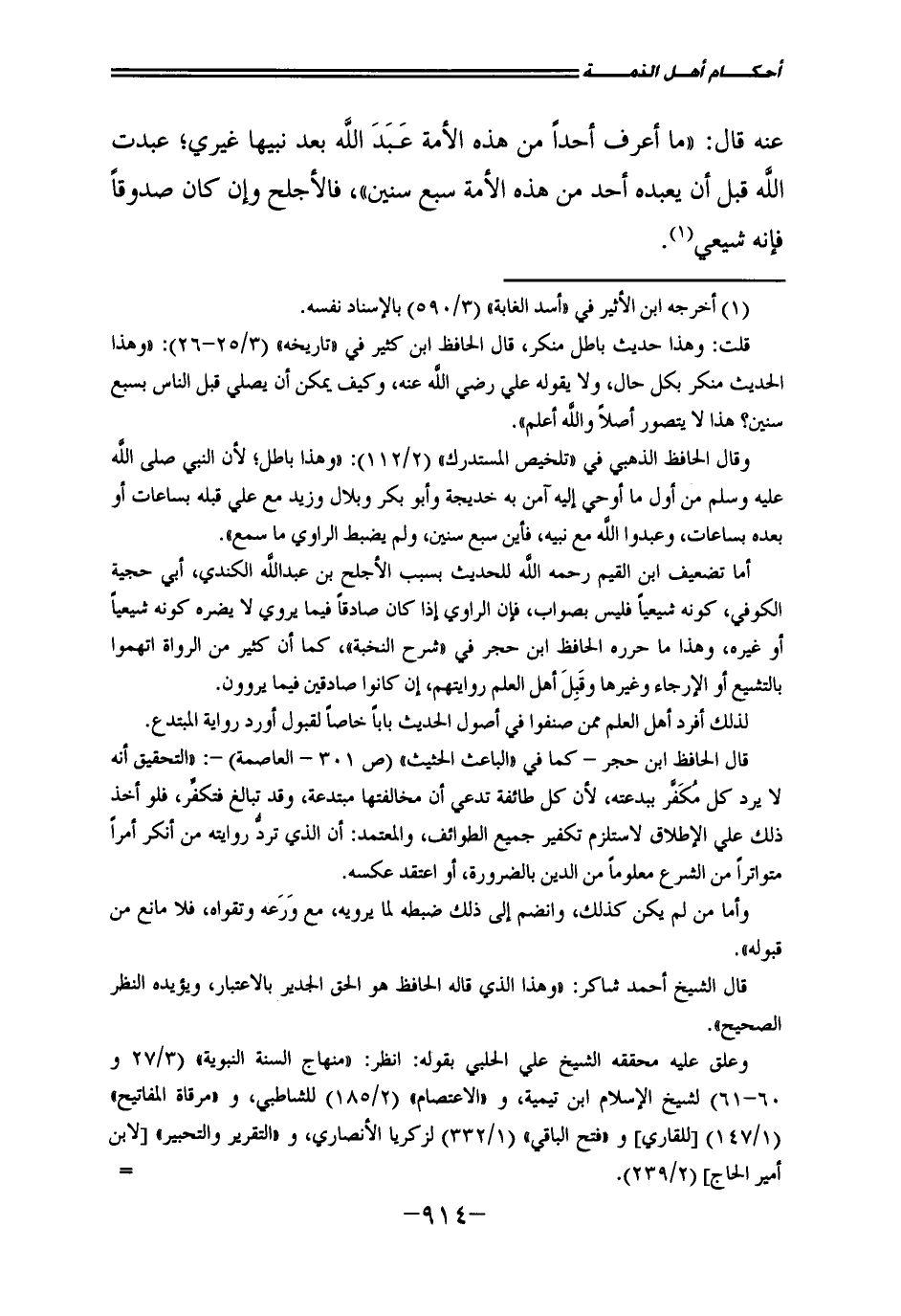 عَنْهُ قَالَ: " مَا أَعْرِفُ أَحَدًا مِنْ هَذِهِ الْأُمَّةِ عَبَدَ اللَّهَ بَعْدَ نَبِيِّهَا غَيْرِي، عَبَدْتُ اللَّهَ قَبْلَ أَنْ يَعْبُدَهُ أَحَدٌ مِنْ هَذِهِ الْأُمَّةِ سَبْعَ سِنِينَ "، فَالْأَجْلَحُ وَإِنْ كَانَ صَدُوقًا، فَإِنَّهُ شِيعِيٌّ.