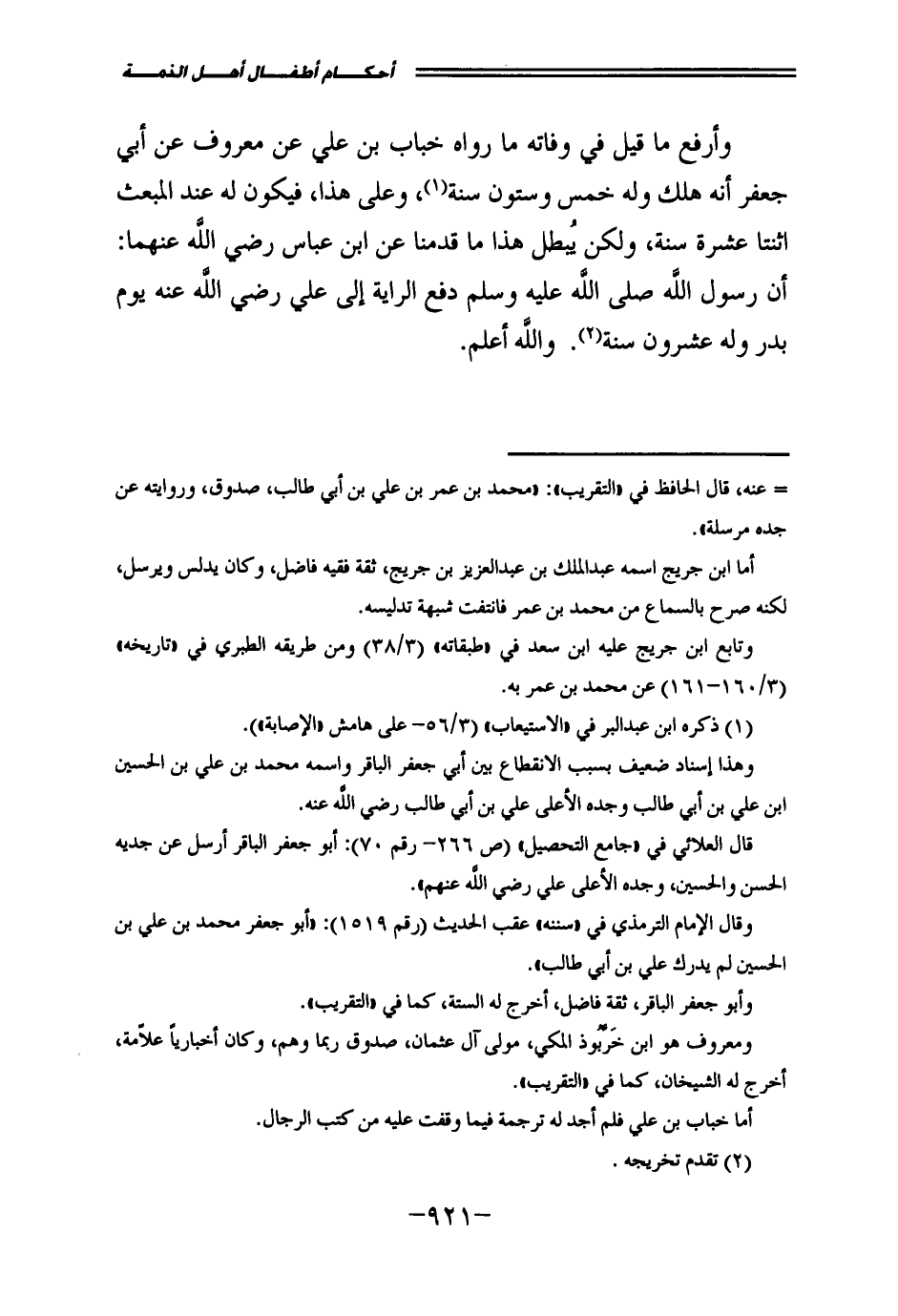 وَأَرْفَعُ مَا قِيلَ فِي وَفَاتِهِ مَا رَوَاهُ خَبَّابُ بْنُ عَلِيٍّ، عَنْ مَعْرُوفٍ، عَنْ أَبِي جَعْفَرٍ أَنَّهُ هَلَكَ وَلَهُ خَمْسٌ وَسِتُّونَ سَنَةً، وَعَلَى هَذَا، فَيَكُونُ لَهُ عِنْدَ الْمَبْعَثِ اثْنَتَا عَشْرَةَ سَنَةً، وَلَكِنْ يُبْطِلُ هَذَا مَا قَدَّمْنَا عَنِ ابْنِ عَبَّاسٍ - رَضِيَ اللَّهُ عَنْهُمَا -: أَنَّ «رَسُولَ اللَّهِ - صَلَّى اللَّهُ عَلَيْهِ وَسَلَّمَ - دَفَعَ الرَّايَةَ إِلَى عَلِيٍّ - رَضِيَ اللَّهُ عَنْهُ - يَوْمَ بَدْرٍ، وَلَهُ عِشْرُونَ سَنَةً» وَاللَّهُ أَعْلَمُ.