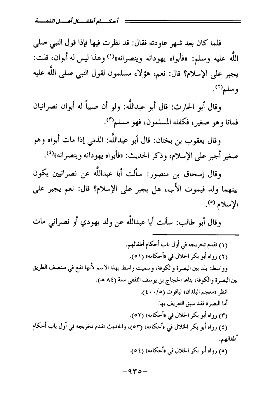 فَلَمَّا كَانَ بَعْدَ شَهْرٍ عَاوَدْتُهُ، فَقَالَ: قَدْ نَظَرْتُ فِيهَا فَإِذَا قَوْلُ النَّبِيِّ - صَلَّى اللَّهُ عَلَيْهِ وَسَلَّمَ -: " «فَأَبَوَاهُ يُهَوِّدَانِهِ، وَيُنَصِّرَانِهِ» "، وَهَذَا لَيْسَ لَهُ أَبَوَانِ، قُلْتُ: يُجْبَرُ عَلَى الْإِسْلَامِ؟ قَالَ: نَعَمْ، هَؤُلَاءِ مُسْلِمُونَ لِقَوْلِ النَّبِيِّ - صَلَّى اللَّهُ عَلَيْهِ وَسَلَّمَ -.