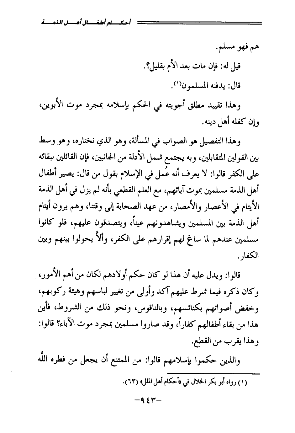 وَهَذَا التَّفْصِيلُ هُوَ الصَّوَابُ فِي الْمَسْأَلَةِ، وَهُوَ الَّذِي نَخْتَارُهُ، وَهُوَ وَسَطٌ بَيْنَ الْقَوْلَيْنِ الْمُتَقَابِلَيْنِ، وَبِهِ يَجْتَمِعُ شَمْلُ الْأَدِلَّةِ مِنَ الْجَانِبَيْنِ، فَإِنَّ الْقَائِلِينَ بِبَقَائِهِ عَلَى الْكُفْرِ قَالُوا: لَا يُعْرَفُ أَنَّهُ عُمِلَ فِي الْإِسْلَامِ بِقَوْلِ مَنْ قَالَ: يَصِيرُ أَطْفَالُ أَهْلِ الذِّمَّةِ مُسْلِمِينَ بِمَوْتِ آبَائِهِمْ، مَعَ الْعِلْمِ الْقَطْعِيِّ بِأَنَّهُ لَمْ يَزَلْ فِي أَهْلِ الذِّمَّةِ الْأَيْتَامُ فِي الْأَعْصَارِ وَالْأَمْصَارِ، مِنْ عَهْدِ الصَّحَابَةِ إِلَى وَقْتِنَا، وَهُمْ يَرَوْنَ أَيْتَامَ أَهْلِ الذِّمَّةِ بَيْنَ الْمُسْلِمِينَ وَيُشَاهِدُونَهُمْ عَيْنًا، وَيَتَصَدَّقُونَ عَلَيْهِمْ، فَلَوْ كَانُوا مُسْلِمِينَ عِنْدَهُمْ لَمَا سَاغَ لَهُمْ إِقْرَارُهُمْ عَلَى الْكُفْرِ، وَأَلَّا يَحُولُوا بَيْنَهُمْ وَبَيْنَ الْكُفَّارِ.