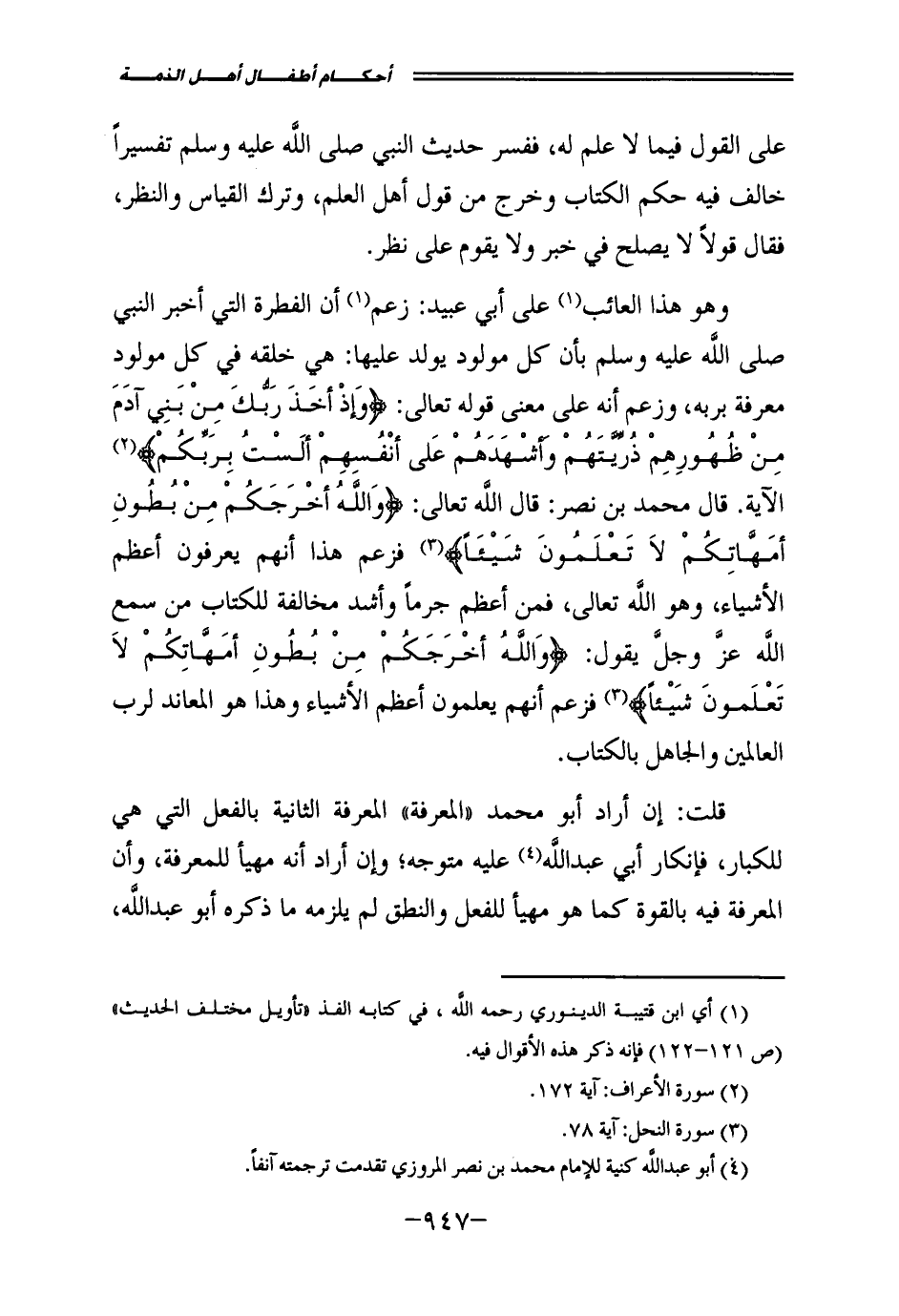 وَهُوَ هَذَا الْعَائِبُ عَلَى أَبِي عُبَيْدٍ: زَعَمَ أَنَّ الْفِطْرَةَ الَّتِي أَخْبَرَ النَّبِيُّ - صَلَّى اللَّهُ عَلَيْهِ وَسَلَّمَ - بِأَنَّ كُلَّ مَوْلُودٍ يُولَدُ عَلَيْهَا: هِيَ خَلْقُهُ فِي كُلِّ مَوْلُودٍ مَعْرِفَةً بِرَبِّهِ، وَزَعَمَ أَنَّهُ عَلَى مَعْنَى قَوْلِهِ تَعَالَى: {وَإِذْ أَخَذَ رَبُّكَ مِنْ بَنِي آدَمَ مِنْ ظُهُورِهِمْ ذُرِّيَّتَهُمْ وَأَشْهَدَهُمْ عَلَى أَنْفُسِهِمْ أَلَسْتُ بِرَبِّكُمْ} [الأعراف: 172] الْآيَةَ، قَالَ مُحَمَّدُ بْنُ نَصْرٍ: قَالَ اللَّهُ تَعَالَى: {وَاللَّهُ أَخْرَجَكُمْ مِنْ بُطُونِ أُمَّهَاتِكُمْ لَا تَعْلَمُونَ شَيْئًا} [النحل: 78] ، فَزَعَمَ هَذَا أَنَّهُمْ يَعْرِفُونَ أَعْظَمَ الْأَشْيَاءِ، وَهُوَ اللَّهُ تَعَالَى، فَمَنْ أَعْظَمُ جُرْمًا، وَأَشَدُّ مُخَالَفَةً لِلْكِتَابِ مَنْ سَمِعَ اللَّهَ عَزَّ وَجَلَّ يَقُولُ: {وَاللَّهُ أَخْرَجَكُمْ مِنْ بُطُونِ أُمَّهَاتِكُمْ لَا تَعْلَمُونَ شَيْئًا} [النحل: 78] ، فَزَعَمَ أَنَّهُمْ يَعْلَمُونَ أَعْظَمَ الْأَشْيَاءِ، وَهَذَا هُوَ الْمُعَانِدُ لِرَبِّ الْعَالَمِينَ، وَالْجَاهِلُ بِالْكِتَابِ.