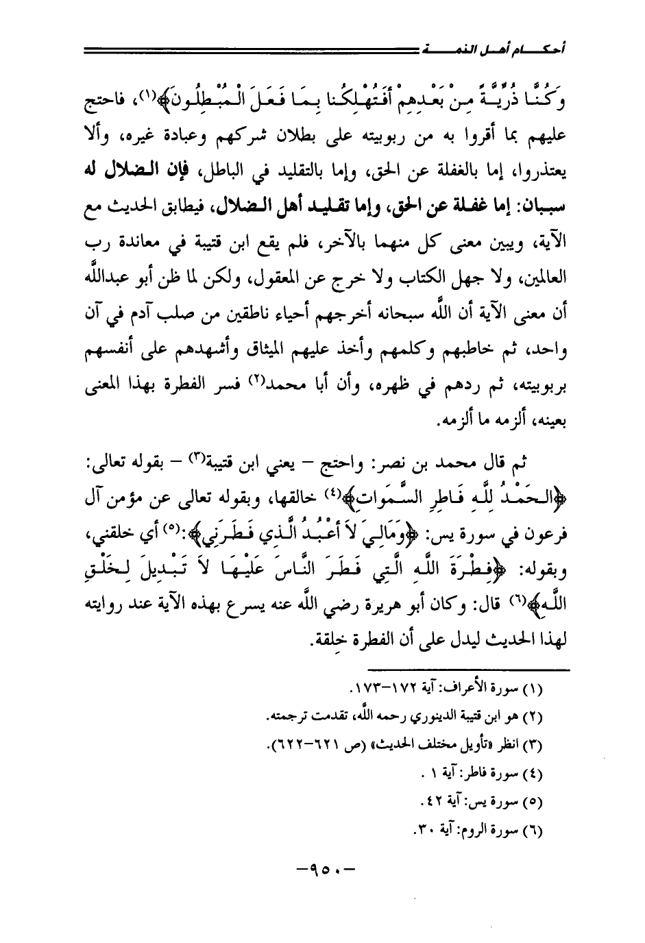 فَاحْتَجَّ عَلَيْهِمْ بِمَا أَقَرُّوا بِهِ مِنْ رُبُوبِيَّتِهِ عَلَى بُطْلَانِ شِرْكِهِمْ وَعِبَادَةِ غَيْرِهِ، وَأَلَّا يَعْتَذِرُوا، إِمَّا بِالْغَفْلَةِ عَنِ الْحَقِّ، وَإِمَّا بِالتَّقْلِيدِ فِي الْبَاطِلِ، فَإِنَّ الضَّلَالَ لَهُ سَبَبَانِ: إِمَّا غَفْلَةٌ عَنِ الْحَقِّ، وَإِمَّا تَقْلِيدُ أَهْلِ الضَّلَالِ، فَيُطَابِقُ الْحَدِيثَ مَعَ الْآيَةِ، وَيُبَيِّنُ مَعْنَى كُلٍّ مِنْهُمَا بِالْآخَرِ، فَلَمْ يَقَعِ ابْنُ قُتَيْبَةَ فِي مُعَانَدَةِ رَبِّ الْعَالَمِينَ، وَلَا جَهِلَ الْكِتَابَ، وَلَا خَرَجَ عَنِ الْمَعْقُولِ، وَلَكِنْ لَمَّا ظَنَّ أَبُو عَبْدِ اللَّهِ أَنَّ مَعْنَى الْآيَةِ أَنَّ اللَّهَ سُبْحَانَهُ أَخْرَجَهُمْ أَحْيَاءً نَاطِقِينَ مِنْ صُلْبِ آدَمَ فِي آنٍ وَاحِدٍ، ثُمَّ خَاطَبَهُمْ، وَكَلَّمَهُمْ وَأَخَذَ عَلَيْهِمُ الْمِيثَاقَ وَأَشْهَدَهُمْ عَلَى أَنْفُسِهِمْ بِرُبُوبِيَّتِهِ، ثُمَّ رَدَّهُمْ فِي ظَهْرِهِ، وَأَنَّ أَبَا مُحَمَّدٍ فَسَّرَ الْفِطْرَةَ بِهَذَا الْمَعْنَى بِعَيْنِهِ أَلْزَمَهُ مَا أَلْزَمَهُ.