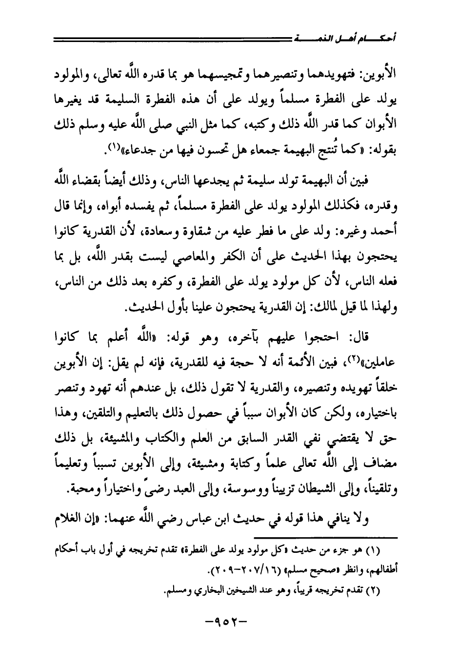 الْأَبَوَيْنِ: فَتَهْوِيدُهُمَا، وَتَنْصِيرُهُمَا، وَتَمْجِيسُهُمَا، هُوَ بِمَا قَدَّرَهُ اللَّهُ تَعَالَى، وَالْمَوْلُودُ يُولَدُ عَلَى الْفِطْرَةِ مُسْلِمًا، وَيُولَدُ عَلَى أَنَّ هَذِهِ الْفِطْرَةَ السَّلِيمَةَ قَدْ يُغَيِّرُهَا الْأَبَوَانِ كَمَا قَدَّرَ اللَّهُ ذَلِكَ، وَكَتَبَهُ، كَمَا مَثَّلَ النَّبِيُّ - صَلَّى اللَّهُ عَلَيْهِ وَسَلَّمَ - ذَلِكَ بِقَوْلِهِ: " «كَمَا تُنْتَجُ الْبَهِيمَةُ جَمْعَاءَ هَلْ تُحِسُّونَ فِيهِمَا مِنْ جَدْعَاءَ» ".