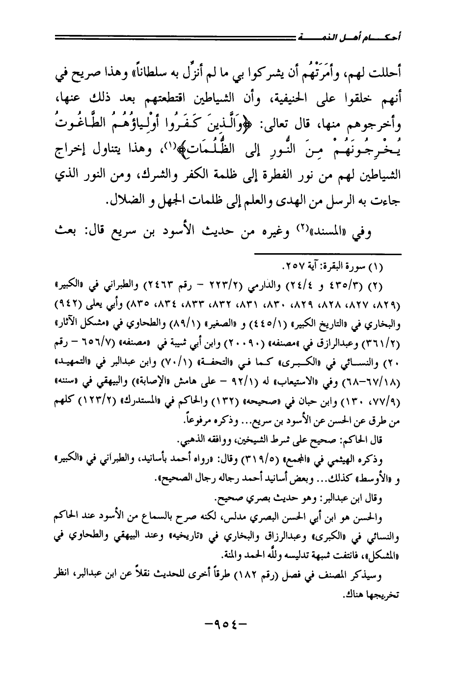 أَحْلَلْتُ لَهُمْ، وَأَمَرَتْهُمْ أَنْ يُشْرِكُوا بِي مَا لَمْ أُنَزِّلْ بِهِ سُلْطَانًا» " وَهَذَا صَرِيحٌ فِي أَنَّهُمْ خُلِقُوا عَلَى الْحَنِيفِيَّةِ، وَأَنَّ الشَّيَاطِينَ اقْتَطَعَتْهُمْ بَعْدَ ذَلِكَ عَنْهَا، وَأَخْرَجُوهُمْ مِنْهَا، قَالَ تَعَالَى: {وَالَّذِينَ كَفَرُوا أَوْلِيَاؤُهُمُ الطَّاغُوتُ يُخْرِجُونَهُمْ مِنَ النُّورِ إِلَى الظُّلُمَاتِ} [البقرة: 257] ، وَهَذَا يَتَنَاوَلُ إِخْرَاجَ الشَّيَاطِينِ لَهُمْ مِنْ نُورِ الْفِطْرَةِ إِلَى ظُلْمَةِ الْكُفْرِ وَالشِّرْكِ، وَمِنَ النُّورِ الَّذِي جَاءَتْ بِهِ الرُّسُلُ مِنَ الْهُدَى، وَالْعِلْمِ إِلَى ظُلُمَاتِ الْجَهْلِ وَالضَّلَالِ.