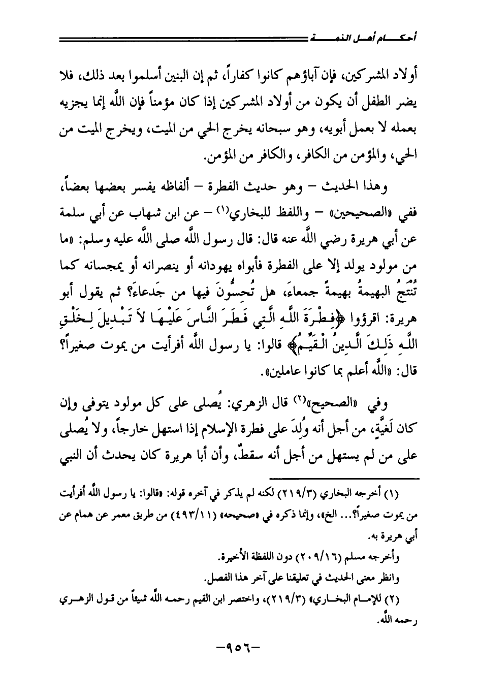 وَهَذَا الْحَدِيثُ - وَهُوَ حَدِيثُ الْفِطْرَةِ - أَلْفَاظُهُ يُفَسِّرُ بَعْضُهَا بَعْضًا، فَفِي الصَّحِيحَيْنِ - وَاللَّفْظُ لِلْبُخَارِيِّ - عَنِ ابْنِ شِهَابٍ، عَنْ أَبِي سَلَمَةَ، عَنْ أَبِي هُرَيْرَةَ - رَضِيَ اللَّهُ عَنْهُ - قَالَ: قَالَ رَسُولُ اللَّهِ - صَلَّى اللَّهُ عَلَيْهِ وَسَلَّمَ -: " «مَا مِنْ مَوْلُودٍ يُولَدُ إِلَّا عَلَى الْفِطْرَةِ فَأَبَوَاهُ يُهَوِّدَانِهِ، أَوْ يُنَصِّرَانِهِ، أَوْ يُمَجِّسَانِهِ كَمَا تُنْتِجُ الْبَهِيمَةُ بَهِيمَةً جَمْعَاءَ، هَلْ تُحِسُّونَ فِيهَا مِنْ جَدْعَاءَ؟ ثُمَّ يَقُولُ أَبُو هُرَيْرَةَ اقْرَءُوا: {فِطْرَةَ اللَّهِ الَّتِي فَطَرَ النَّاسَ عَلَيْهَا لَا تَبْدِيلَ لِخَلْقِ اللَّهِ ذَلِكَ الدِّينُ الْقَيِّمُ} [الروم: 30] ، قَالُوا: يَا رَسُولَ اللَّهِ، أَفَرَأَيْتَ مَنْ يَمُوتُ صَغِيرًا؟ قَالَ: " اللَّهُ أَعْلَمُ بِمَا كَانُوا عَامِلِينَ» ".
