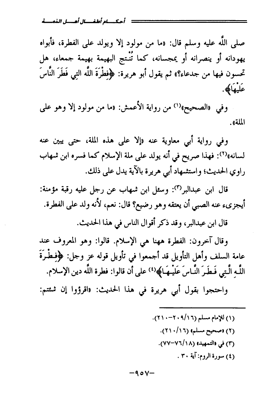 - صَلَّى اللَّهُ عَلَيْهِ وَسَلَّمَ - قَالَ: " «مَا مِنْ مَوْلُودٍ إِلَّا وَيُولَدُ عَلَى الْفِطْرَةِ، فَأَبَوَاهُ يُهَوِّدَانِهِ، أَوْ يُنَصِّرَانِهِ، أَوْ يُمَجِّسَانِهِ كَمَا تُنْتِجُ الْبَهِيمَةُ بَهِيمَةً جَمْعَاءَ هَلْ تُحِسُّونَ فِيهَا مِنْ جَدْعَاءَ؟ " ثُمَّ يَقُولُ أَبُو هُرَيْرَةَ: {فِطْرَةَ اللَّهِ الَّتِي فَطَرَ النَّاسَ عَلَيْهَا} [الروم: 30] » .