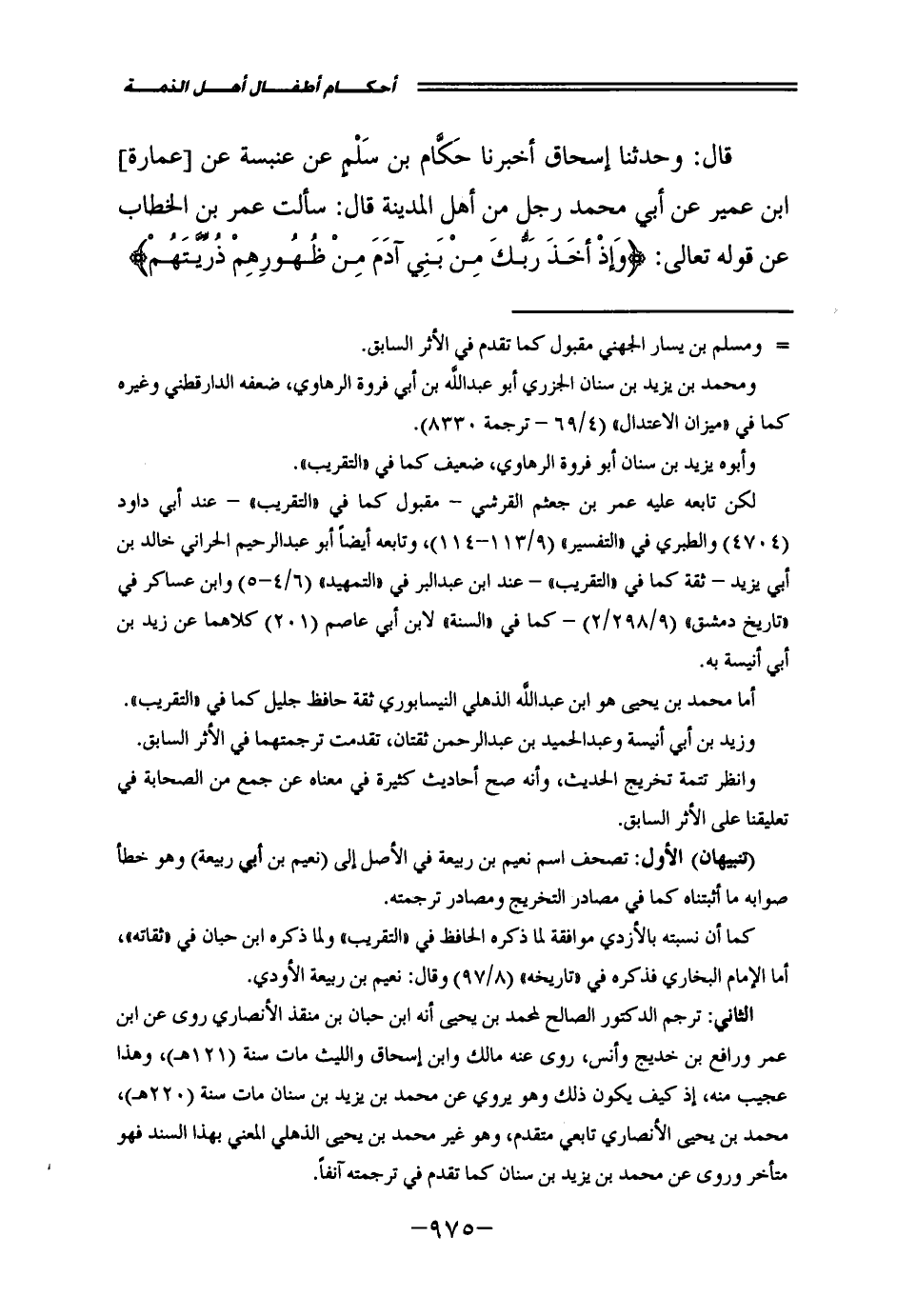 [عُمَارَةَ] بْنِ عُمَيْرٍ، عَنْ أَبِي مُحَمَّدٍ رَجُلٍ مِنْ أَهْلِ الْمَدِينَةِ قَالَ: «سَأَلْتُ عُمَرَ بْنِ الْخَطَّابِ عَنْ قَوْلِهِ تَعَالَى: {وَإِذْ أَخَذَ رَبُّكَ مِنْ بَنِي آدَمَ مِنْ ظُهُورِهِمْ ذُرِّيَّتَهُمْ} [الأعراف: 172]