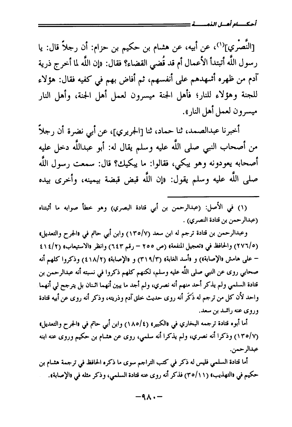 [النَّصْرِيِّ] ، عَنْ أَبِيهِ، عَنْ هِشَامِ بْنِ حَكِيمِ بْنِ حِزَامٍ: «أَنَّ رَجُلًا قَالَ: يَا رَسُولَ اللَّهِ، أَتُبْتَدَأُ الْأَعْمَالُ، أَمْ قَدْ قُضِيَ الْقَضَاءُ؟ فَقَالَ: " إِنَّ اللَّهَ لَمَّا أَخْرَجَ ذُرِّيَّةَ آدَمَ مِنْ ظَهْرِهِ أَشْهَدَهُمْ عَلَى أَنْفُسِهِمْ، ثُمَّ أَفَاضَ بِهِمْ فِي كَفَّيْهِ فَقَالَ: هَؤُلَاءِ لِلْجَنَّةِ، وَهَؤُلَاءِ لِلنَّارِ، فَأَهْلُ الْجَنَّةِ مُيَسَّرُونَ لِعَمَلِ أَهْلِ الْجَنَّةِ، وَأَهْلُ النَّارِ مُيَسَّرُونَ لِعَمَلِ أَهْلِ النَّارِ» .