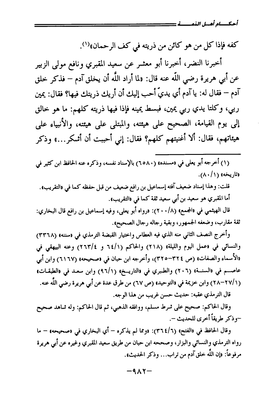 كَفَّهُ فَإِذَا كُلُّ مَنْ هُوَ كَائِنٌ مِنْ ذُرِّيَّتِهِ فِي كَفِّ الرَّحْمَنِ» ".