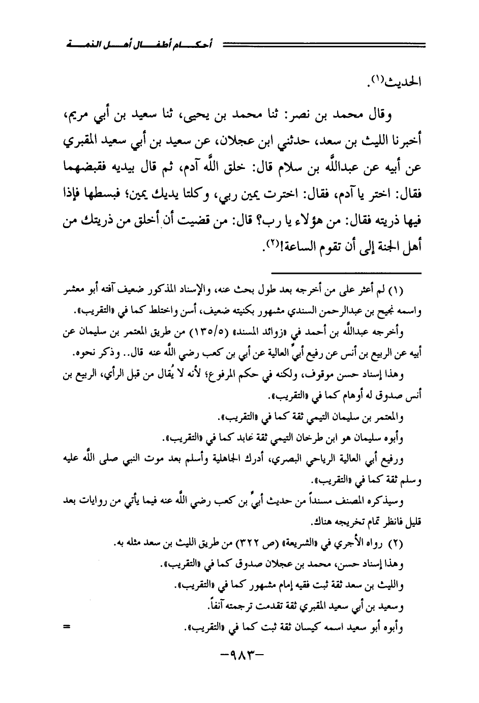 وَقَالَ مُحَمَّدُ بْنُ نَصْرٍ: ثَنَا مُحَمَّدُ بْنُ يَحْيَى، ثَنَا سَعِيدُ بْنُ أَبِي مَرْيَمَ، أَخْبَرَنَا اللَّيْثُ بْنُ سَعْدٍ، حَدَّثَنِي ابْنُ عَجْلَانَ، عَنْ سَعِيدِ بْنِ أَبِي سَعِيدٍ الْمَقْبُرِيِّ، عَنْ أَبِيهِ، عَنْ عَبْدِ اللَّهِ بْنِ سَلَامٍ قَالَ: خَلَقَ اللَّهُ آدَمَ، ثُمَّ قَالَ: بِيَدَيْهِ، فَقَبَضَهُمَا، فَقَالَ: اخْتَرْ يَا آدَمُ، فَقَالَ: اخْتَرْتُ يَمِينَ رَبِّي، وَكِلْتَا يَدَيْكَ يَمِينٌ، فَبَسَطَهَا، فَإِذَا فِيهَا ذُرِّيَّتُهُ، فَقَالَ مَنْ هَؤُلَاءِ يَا رَبِّ؟ قَالَ: مَنْ قَضَيْتُ أَنْ أَخْلُقَ مِنْ ذُرِّيَّتِكَ مِنْ أَهْلِ الْجَنَّةِ إِلَى أَنْ تَقُومَ السَّاعَةُ.