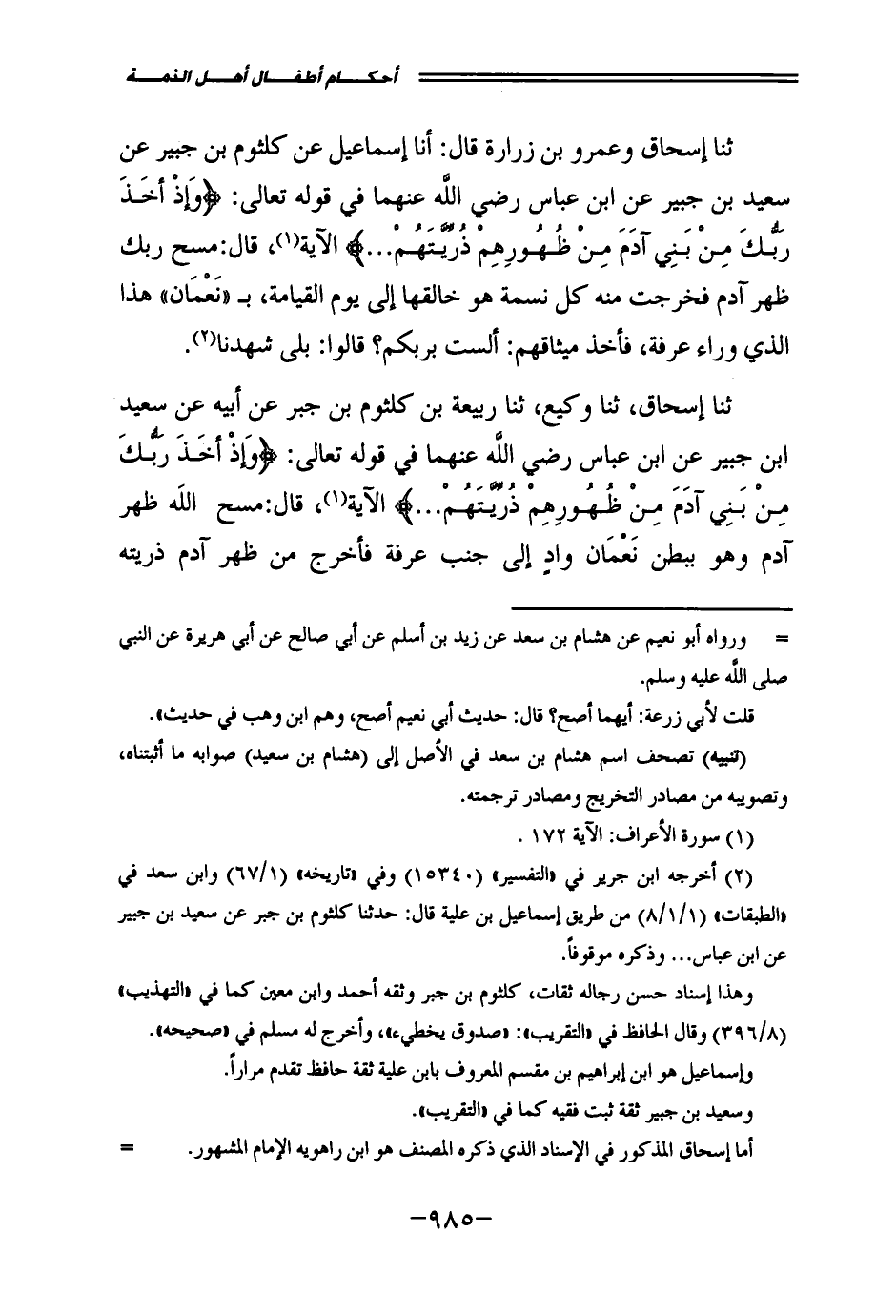 ثَنَا إِسْحَاقُ، وَعَمْرُو بْنُ زُرَارَةَ قَالَ: أَنَا إِسْمَاعِيلُ، عَنْ كُلْثُومِ بْنِ جُبَيْرٍ، عَنْ سَعِيدِ بْنِ جُبَيْرٍ، عَنِ ابْنِ عَبَّاسٍ - رَضِيَ اللَّهُ عَنْهُمَا - فِي قَوْلِهِ تَعَالَى: {وَإِذْ أَخَذَ رَبُّكَ مِنْ بَنِي آدَمَ مِنْ ظُهُورِهِمْ ذُرِّيَّتَهُمْ} [الأعراف: 172] الْآيَةَ، قَالَ: مَسَحَ رَبُّكَ ظَهْرَ آدَمَ فَخَرَجَتْ مِنْهُ كُلُّ نَسَمَةٍ هُوَ خَالِقُهَا إِلَى يَوْمِ الْقِيَامَةِ، بِ " نُعْمَانَ " هَذَا الَّذِي وَرَاءَ عَرَفَةَ فَأَخَذَ مِيثَاقَهُمْ أَلَسْتُ بِرَبِّكُمْ؟ قَالُوا: بَلَى شَهِدْنَا.