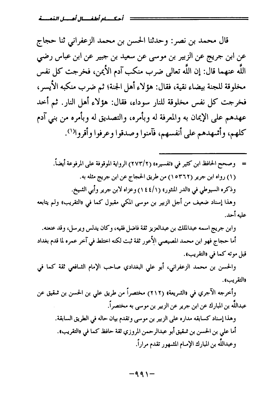 قَالَ مُحَمَّدُ بْنُ نَصْرٍ: وَحَدَّثَنَا الْحَسَنُ بْنُ مُحَمَّدٍ الزَّعْفَرَانِيُّ، ثَنَا حَجَّاجٌ، عَنِ ابْنِ جُرَيْجٍ، عَنِ الزُّبَيْرِ بْنِ مُوسَى، عَنْ سَعِيدِ بْنِ جُبَيْرٍ، عَنِ ابْنِ عَبَّاسٍ - رَضِيَ اللَّهُ عَنْهُمَا - قَالَ: إِنَّ اللَّهَ تَعَالَى ضَرَبَ مَنْكِبَ آدَمَ الْأَيْمَنَ، فَخَرَجَتْ كُلُّ نَفْسٍ مَخْلُوقَةٍ لِلْجَنَّةِ بَيْضَاءَ نَقِيَّةً، فَقَالَ: هَؤُلَاءِ أَهْلُ الْجَنَّةِ، ثُمَّ ضَرَبَ مَنْكِبَهُ الْأَيْسَرَ، فَخَرَجَتْ كُلُّ نَفْسٍ مَخْلُوقَةٍ لِلنَّارِ سَوْدَاءَ، فَقَالَ: هَؤُلَاءِ أَهْلُ النَّارِ، ثُمَّ أَخَذَ عَهْدَهُمْ عَلَى الْإِيمَانِ بِهِ، وَالْمَعْرِفَةِ لَهُ، وَبِأَمْرِهِ، وَالتَّصْدِيقِ لَهُ وَبِأَمْرِهِ مِنْ بَنِي آدَمَ كُلِّهِمْ، وَأَشْهَدَهُمْ عَلَى أَنْفُسِهِمْ، فَآمَنُوا، وَصَدَّقُوا، وَعَرَفُوا، وَأَقَرُّوا.
