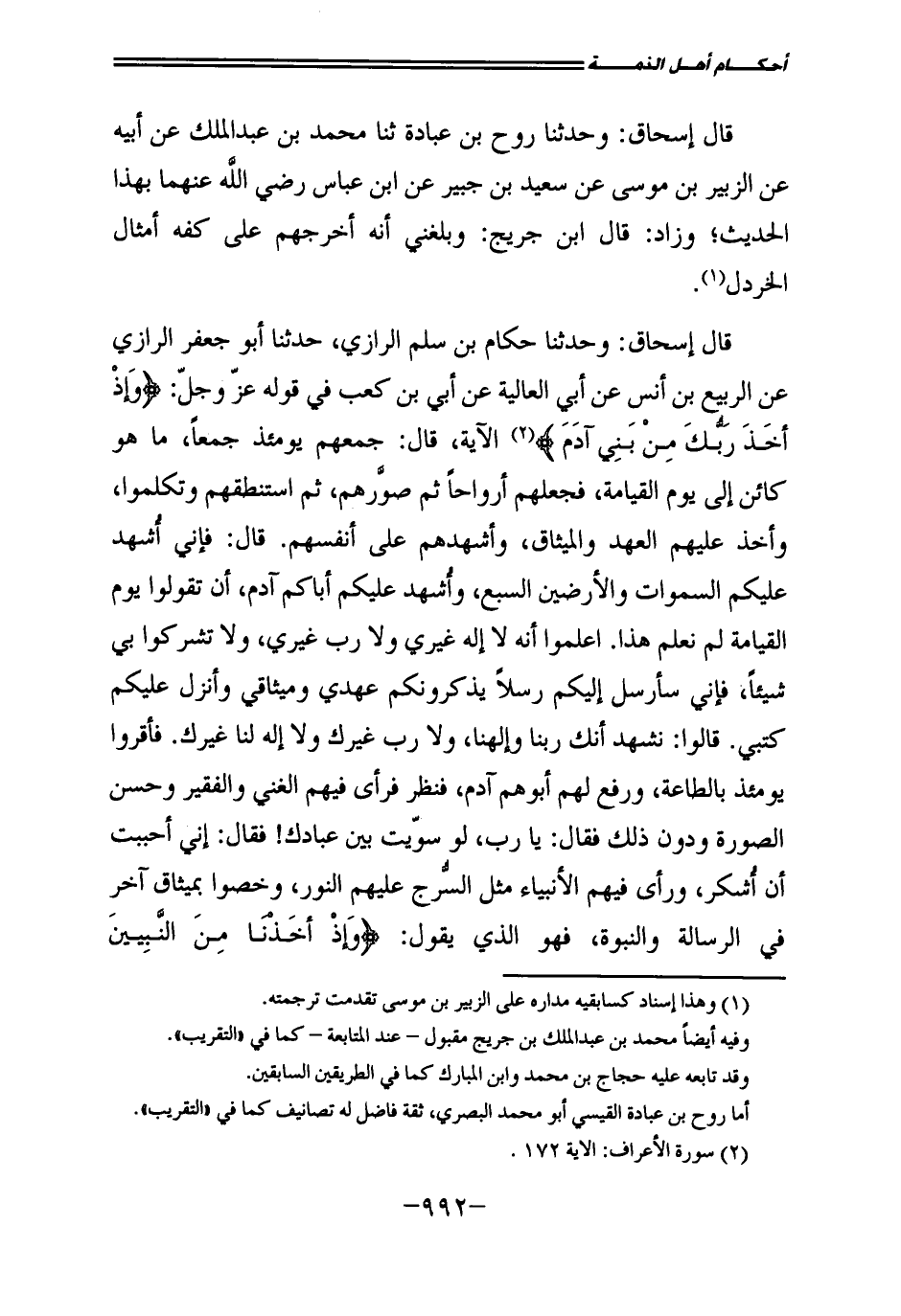 قَالَ إِسْحَاقُ: وَحَدَّثَنَا حَكَّامُ بْنُ سَلْمٍ الرَّازِيُّ، حَدَّثَنَا أَبُو جَعْفَرٍ الرَّازِيُّ، عَنِ الرَّبِيعِ بْنِ أَنَسٍ، عَنْ أَبِي الْعَالِيَةِ، عَنْ أُبَيِّ بْنِ كَعْبٍ فِي قَوْلِهِ عَزَّ وَجَلَّ: {وَإِذْ أَخَذَ رَبُّكَ مِنْ بَنِي آدَمَ} [الأعراف: 172] الْآيَةَ، قَالَ: جَمَعَهُمْ يَوْمَئِذٍ جَمْعًا، مَا هُوَ كَائِنٌ إِلَى يَوْمِ الْقِيَامَةِ، فَجَعَلَهُمْ أَرْوَاحًا، ثُمَّ صَوَّرَهُمْ، ثُمَّ اسْتَنْطَقَهُمْ، وَتَكَلَّمُوا، وَأَخَذَ عَلَيْهِمُ الْعَهْدَ وَالْمِيثَاقَ، وَأَشْهَدَهُمْ عَلَى أَنْفُسِهِمْ. قَالَ: فَإِنِّي أُشْهِدُ عَلَيْكُمُ السَّمَاوَاتِ وَالْأَرَضِينَ السَّبْعَ، وَأُشْهِدُ عَلَيْكُمْ أَبَاكُمْ آدَمَ، أَنْ تَقُولُوا يَوْمَ الْقِيَامَةِ لَمْ نَعْلَمْ هَذَا. اعْلَمُوا أَنَّهُ لَا إِلَهَ غَيْرِي، وَلَا رَبَّ غَيْرِي، وَلَا تُشْرِكُوا بِي شَيْئًا، فَإِنِّي سَأُرْسِلُ إِلَيْكُمْ رُسُلًا يُذَكِّرُونَكُمْ عَهْدِي، وَمِيثَاقِي، وَأُنْزِلُ عَلَيْكُمْ كُتُبِي. قَالُوا: نَشْهَدُ أَنَّكَ رَبُّنَا وَإِلَهُنَا، وَلَا رَبَّ غَيْرُكَ، وَلَا إِلَهَ لَنَا غَيْرُكَ. فَأَقَرُّوا يَوْمَئِذٍ بِالطَّاعَةِ، وَرُفِعَ لَهُمْ أَبُوهُمْ آدَمُ، فَنَظَرَ، فَرَأَى فِيهِمُ الْغَنِيَّ وَالْفَقِيرَ، وَحَسَنَ الصُّورَةِ وَدُونَ ذَلِكَ، فَقَالَ: يَا رَبِّ، لَوْ سَوَّيْتَ بَيْنَ عِبَادِكَ! فَقَالَ: إِنِّي أَحْبَبْتُ أَنْ أُشْكَرَ، وَرَأَى فِيهِمُ الْأَنْبِيَاءَ مِثْلَ السُّرُجِ عَلَيْهِمُ النُّورُ، وَخُصُّوا بِمِيثَاقٍ آخَرَ فِي الرِّسَالَةِ وَالنُّبُوَّةِ، فَهُوَ الَّذِي يَقُولُ: {وَإِذْ أَخَذْنَا مِنَ النَّبِيِّينَ مِيثَاقَهُمْ} [الأحزاب: 7] . . .