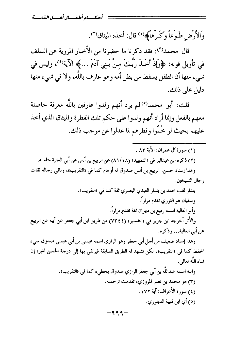 قَالَ مُحَمَّدٌ: فَقَدْ ذَكَرْنَا مَا حَضَرَنَا مِنَ الْأَخْبَارِ الْمَرْوِيَّةِ عَنِ السَّلَفِ فِي تَأْوِيلِ قَوْلِهِ: {وَإِذْ أَخَذَ رَبُّكَ مِنْ بَنِي آدَمَ} [الأعراف: 172] الْآيَةَ، وَلَيْسَ فِي شَيْءٍ مِنْهَا أَنَّ الطِّفْلَ يَسْقُطُ مِنْ بَطْنِ أُمِّهِ وَهُوَ عَارِفٌ بِاللَّهِ، وَلَا فِي شَيْءٍ مِنْهَا دَلِيلٌ عَلَى ذَلِكَ.