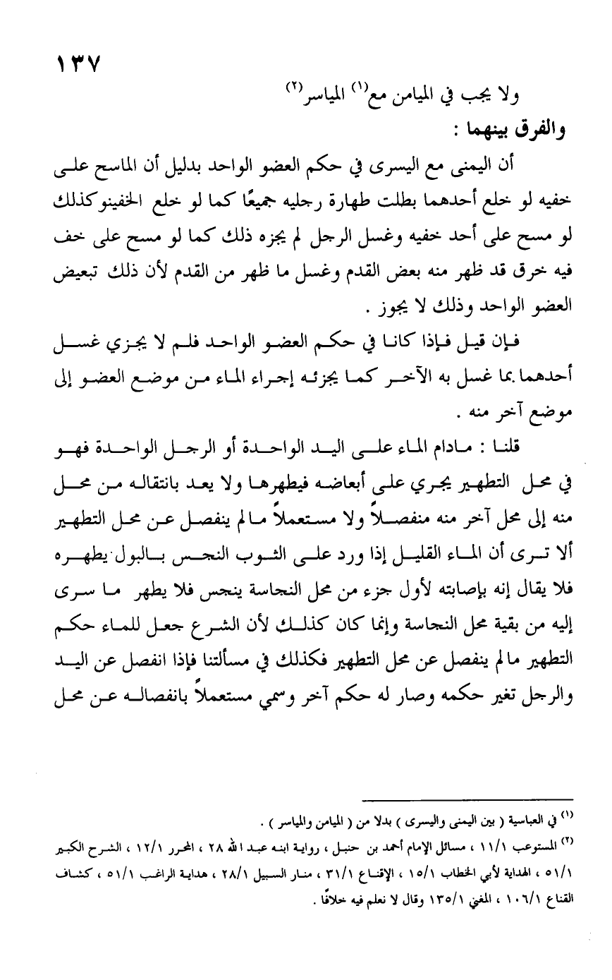 أن اليمنى مع اليسرى في حكم العضو الواحد بدليل أن الماسح على خفيه لو خلع أحدهما بطلت طهارة رجليه جميعًا كما لو خلع الخفين وكذلك لو مسح على أحد خفيه وغسل الرجل لم يجزه ذلك كما لو مسح على خف فيه خرق قد ظهر منه بعض القدم وغسل ما ظهر من القدم لأن ذلك تبعيض العضو الواحد وذلك لا يجوز.