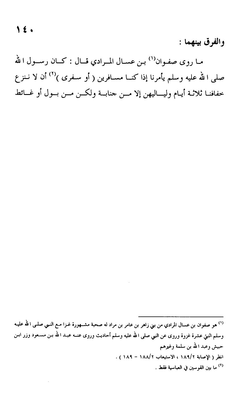 (١) هو صفوان بن عسال المرادي من بن زاهر بن عامر بن مراد له صحبة مشهورة غزا مع النبي صلى الله عليه وسلم اثنتي عشرة غزوة وروى عن النبي صلى الله عليه وسلم أحاديث وروى عنه عبد الله بن مسعود وزر ابن حبيش وعبد الله بن سلمة وغيرهم.