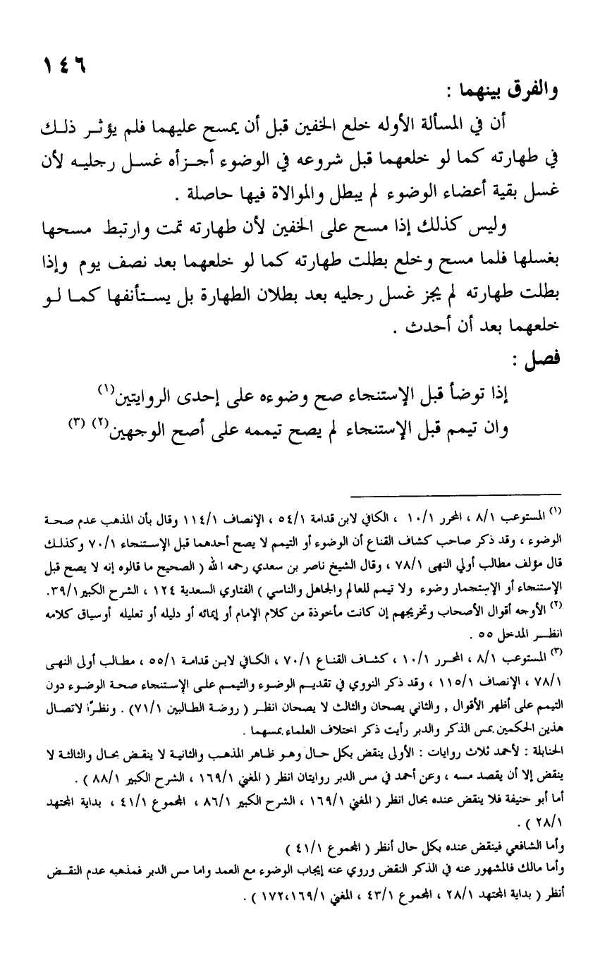 (١) المستوعب ١/ ٨، المحرر ١/ ١٠، الكافي لابن قدامة ١/ ٥٤، الإنصاف ١/ ١١٤ وقال بأن المذهب عدم صحة الوضوء، وقد ذكر صاحب كشاف القناع أن الوضوء أو التيمم لا يصح أحدهما قبل الإستنجاء ١/ ٧٠ وكذلك قال مؤلف مطالب أولى النهي ١/ ٧٨، وقال الشيخ ناصر بن سعدي رحمه الله (الصحيح ما قالوه إنه لا يصح قبل الإستنجاء أو الإستجمار وضوء ولا تيمم للعالم والجاهل والناسي) الفتاوى السعدية ١٢٤، الشرح الكبير ١/ ٣٩.