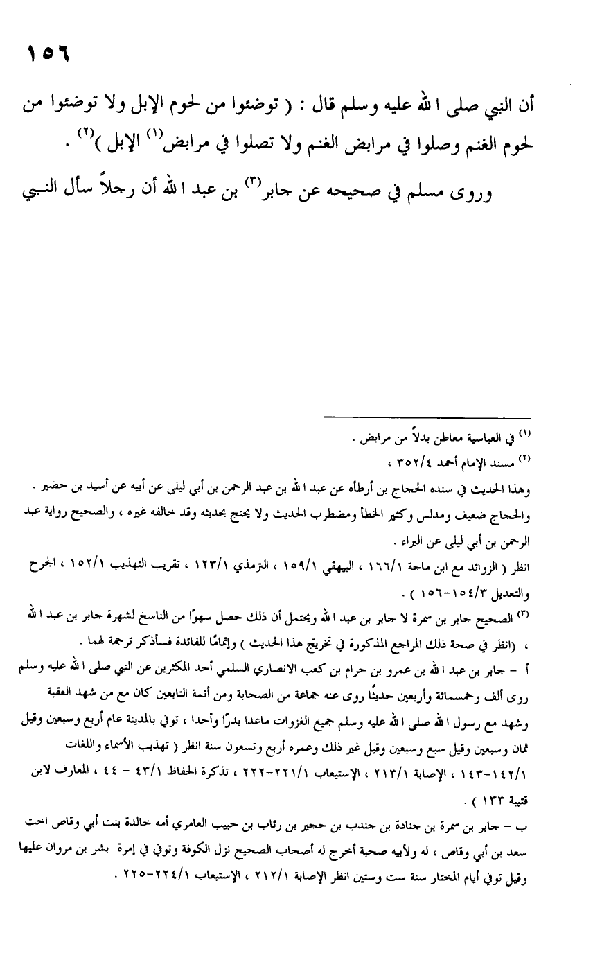 أن النبي صلى الله عليه وسلم قال: (توضئوا من لحوم الإبل ولا توضئوا من لحوم الغنم وصلوا في مرابض الغنم ولا تصلوا في مرابض (١) الإبل) (٢).