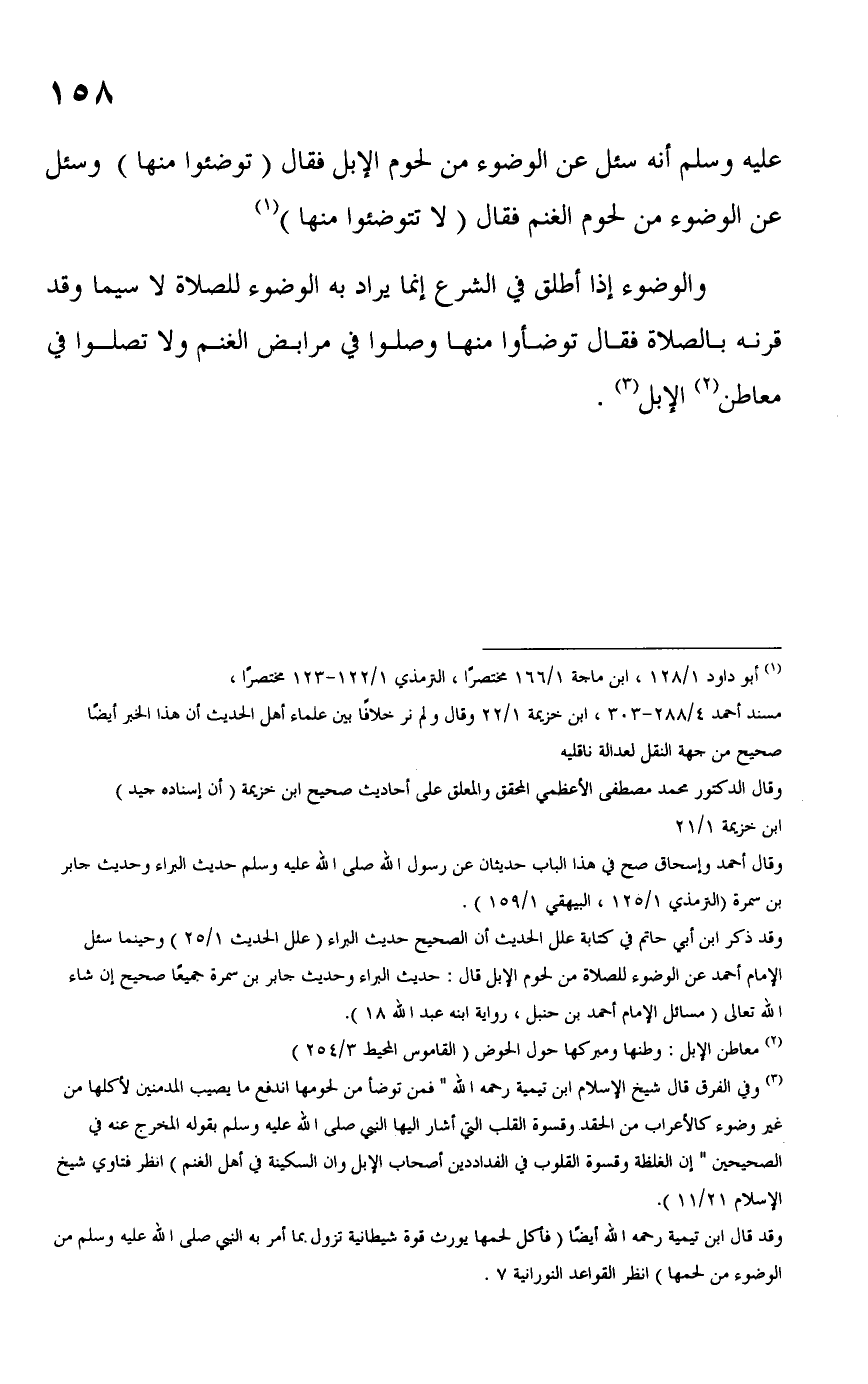 عليه وسلم أنه سئل عن الوضوء من لحوم الإبل فقال (توضئوا منها) وسئل عن الوضوء من لحوم الغنم فقال (لا تتوضئوا منها) (١).
