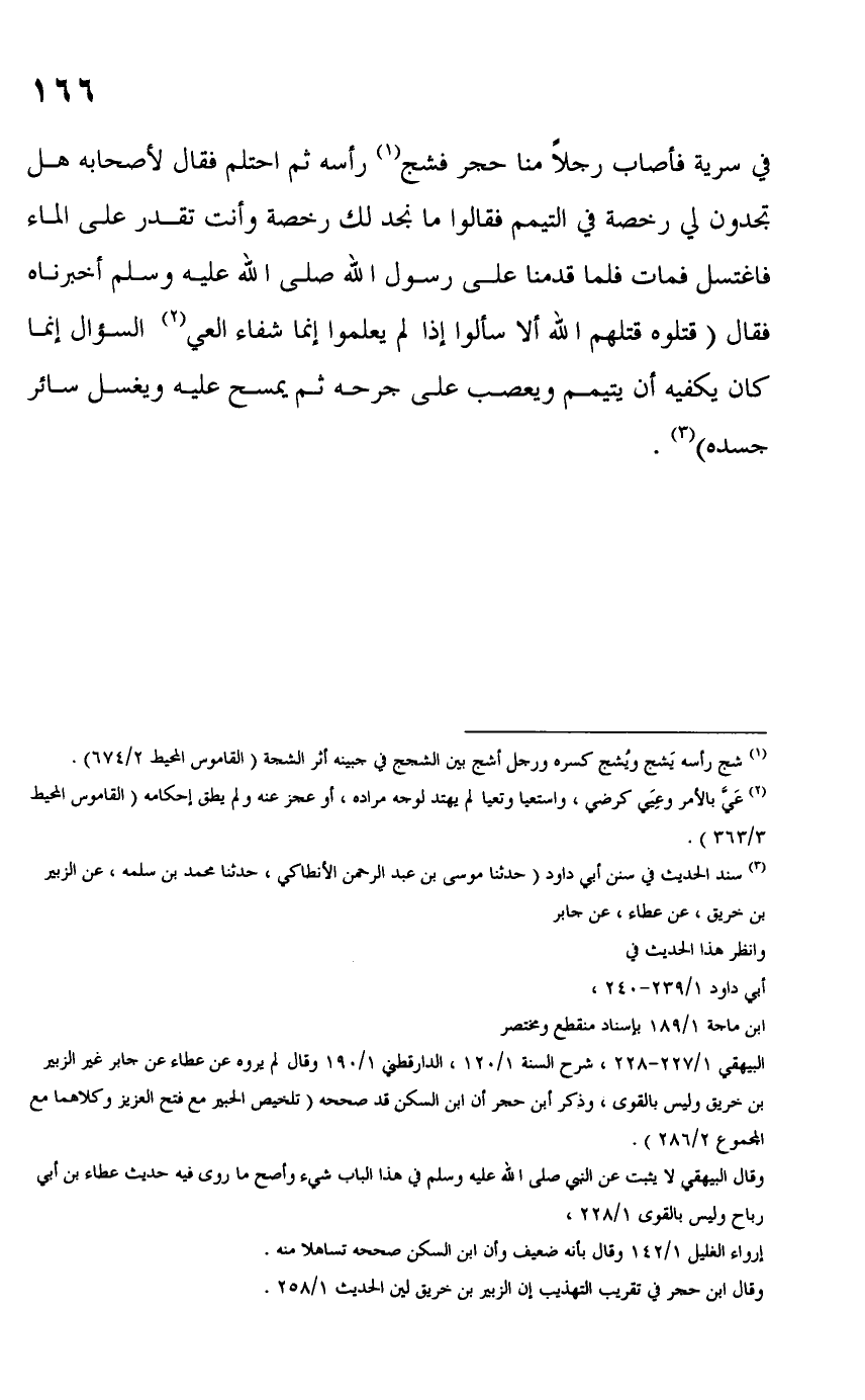 في سرية فأصاب رجلًا منا حجر فشج (١) رأسه ثم احتلم فقال لأصحابه هل تجدون لي رخصة في التيمم فقالوا ما نجد لك رخصة وأنت تقدر على الماء فاغتسل فمات فلما قدمنا على رسول الله صلى الله عليه وسلم أخبرناه فقال (قتلوه قتلهم الله ألا سألوا إذا لم يعلموا إنما شفاء العي (٢) السؤال إنما كان يكفيه أن يتيمم ويعصب على جرحه ثم يمسح عليه ويغسل سائر جسده) (٣).