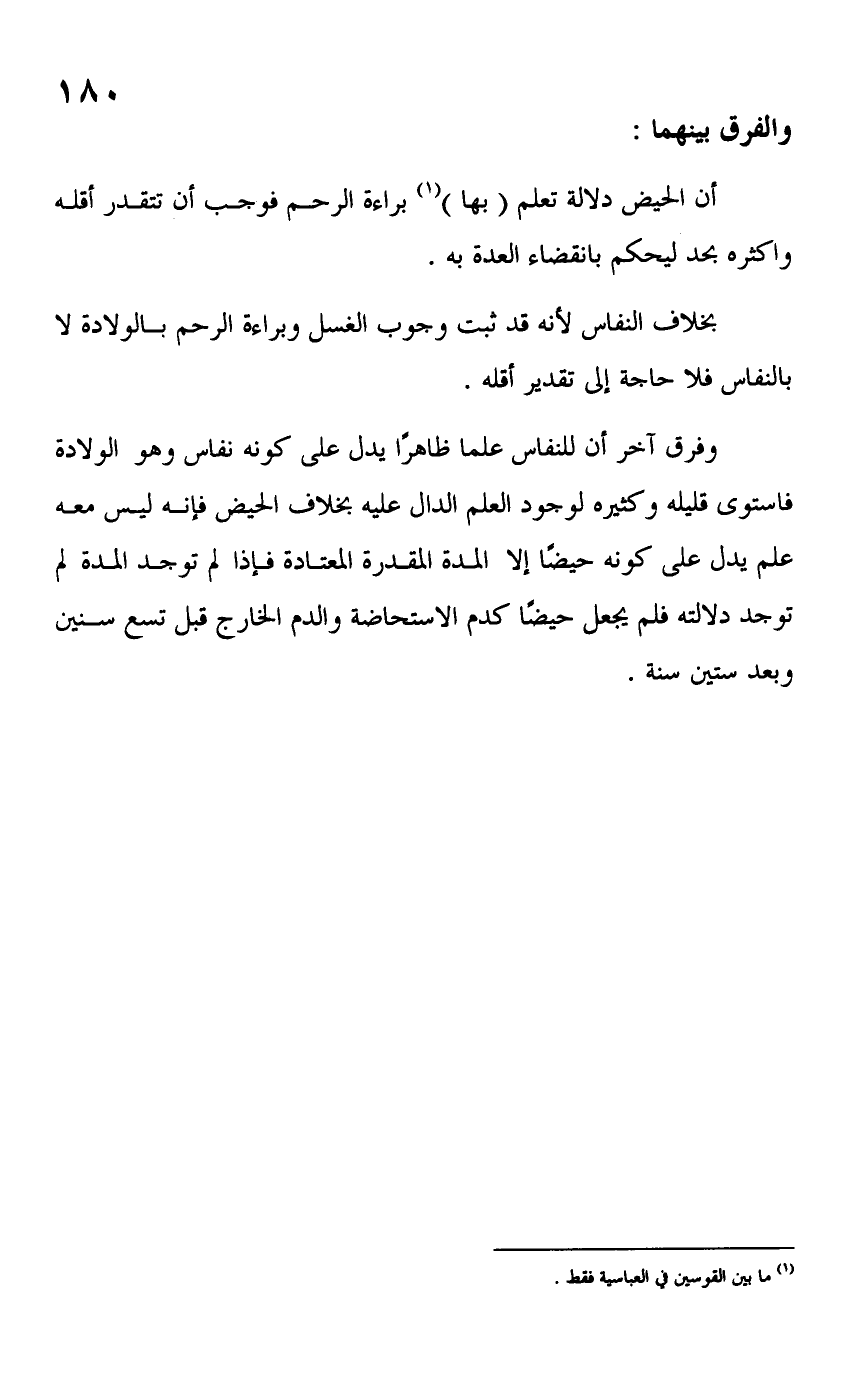 وفرق آخر أن للنفاس علمًا ظاهرًا يدل على كونه نفاس وهو الولادة فاستوى قليله وكثيره لوجود العلم الدال عليه بخلاف الحيض فإنه ليس معه علم يدل على كونه حيضًا إلا المدة المقدرة المعتادة فإذا لم توجد المدة لم توجد دلالته فلم يجعل حيضًا كدم الاستحاضة والدم الخارج قبل تسع سنين وبعد ستين سنة.
