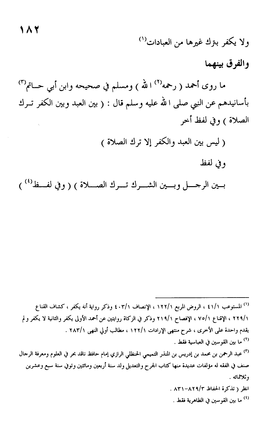 ما روى أحمد (رحمه (٢) الله) ومسلم في صحيحه وابن أبي حاتم (٣) بأسانيدهم عن النبي صلى الله عليه وسلم قال: (بين العبد وبين الكفر ترك الصلاة) وفي لفظ آخر: