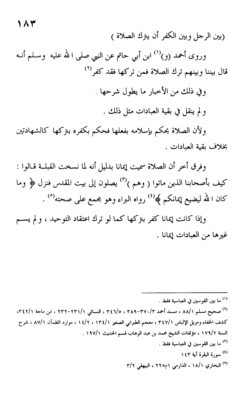 (٢) صحيح مسلم ١/ ٨٨، مسند أحمد ٣/ ٣٧٠ - ٣٨٩، ٥/ ٣٤٦، النسائي ١/ ٢٣١ - ٢٣٢، ابن ماجه ١/ ٣٤٢، كشف الخفاء ومزيل الإلباس ١/ ٣٤٧، معجم الطبراني الصغير ١/ ١٣٤، ٢/ ١٤، موارد الظمآن ١/ ٨٧، شرح السنة ٢/ ١٧٩، مؤلفات الشيخ محمَّد بن عبد الوهاب قسم الحديث ١/ ١٩٧.
