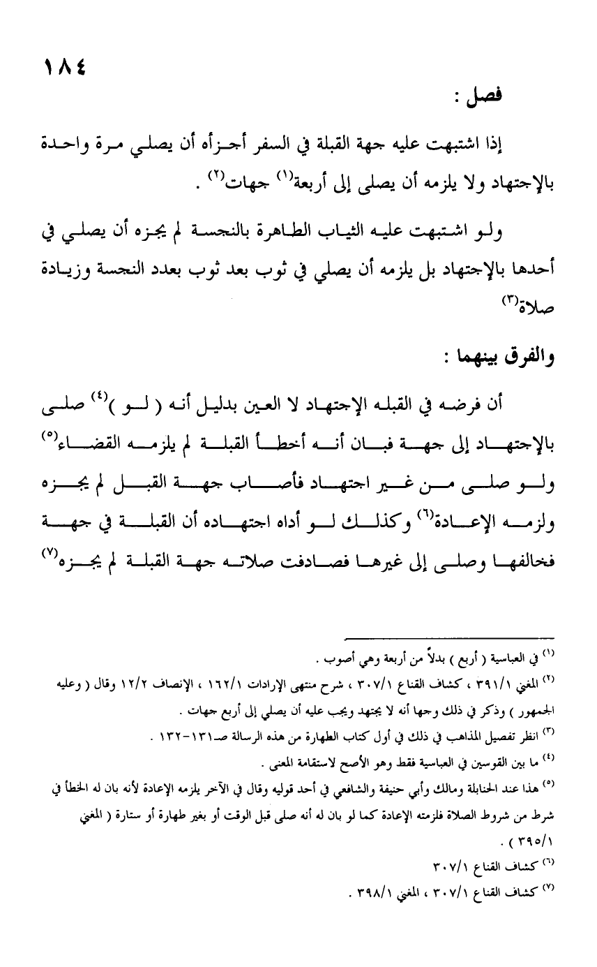 (٢) المغني ١/ ٣٩١، كشاف القناع ١/ ٣٠٧، شرح منتهى الإرادات ١/ ١٦٢، الإنصاف ٢/ ١٢ وقال (وعليه الجمهور) وذكر في ذلك وجها أنه لا يجتهد ويجب عليه أن يصلي إلى أربع جهات.