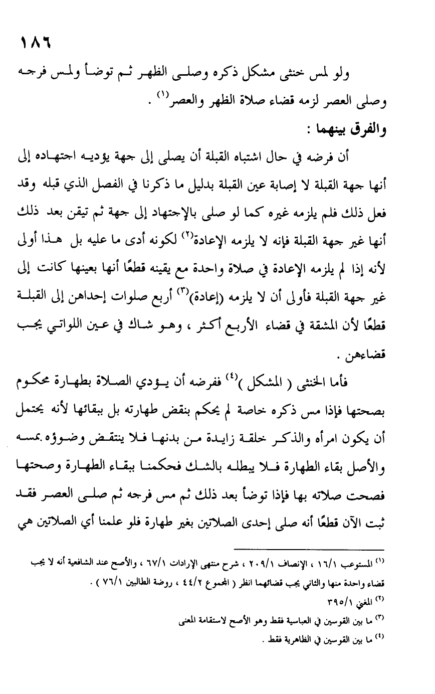 (١) المستوعب ١/ ١٦، الإنصاف ١/ ٢٠٩، شرح منتهى الإرادات ١/ ٦٧، والأصح عند الشافعية أنه لا يجب قضاء واحدة منها والثاني يجب قضائهما انظر (المجموع ٢/ ٤٤، روضة الطالبين ١/ ٧٦).