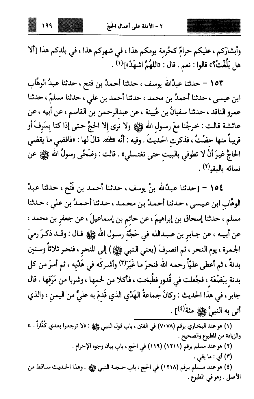 154 - حَدَّثَنَا عَبْدُ اللَّهِ بْنُ يُوسُفَ، حَدَّثَنَا أَحْمَدُ بْنُ فَتْحٍ، حَدَّثَنَا عَبْدُ الْوَهَّابِ بْنُ عِيسَى، حَدَّثَنَا أَحْمَدُ بْنُ مُحَمَّدٍ، حَدَّثَنَا أَحْمَدُ بْنُ عَلِيٍّ، حَدَّثَنَا مُسْلِمٌ، حَدَّثَنَا إِسْحَاقُ بْنُ إِبْرَاهِيمَ، عَنْ حَاتِمِ بْنِ إِسْمَاعِيلَ، عَنْ جَعْفَرِ بْنِ مُحَمَّدٍ، عَنْ أَبِيهِ، عَنْ جَابِرِ بْنِ عَبْدِ اللَّهِ، فِي حَجَّةِ رَسُولِ اللَّهِ صَلَّى اللهُ عَلَيْهِ وَسَلَّمَ، قَالَ: وَقَدْ ذَكَرَ رَمْيَ الْجَمْرَةِ يَوْمَ النَّحْرِ، ثُمَّ انْصَرَفَ، يَعْنِي النَّبِيَّ صَلَّى اللهُ عَلَيْهِ وَسَلَّمَ إِلَى الْمَنْحَرِ §فَنَحَرَ ثَلَاثًا وَسِتِّينَ بَدَنَةً، ثُمَّ أَعْطَى عَلِيًّا رَحِمَهُ اللَّهُ فَنَحَرَ مَا غَبَرَ وَأَشْرَكَهُ فِي هَدْيِهِ، ثُمَّ أَمَرَ مِنْ كُلِّ بَدَنَةٍ بِبَضْعَةٍ، فَجُعِلَتْ فِي قُدُورٍ فَطُبِخَتْ، فَأَكَلَا مِنْ لَحْمِهَا وَشَرِبَا مِنْ مَرَقِهَا قَالَ جَابِرٌ فِي هَذَا الْحَدِيثِ: وَكَانَ جَمَاعَةُ الْهَدْيِ الَّذِي قَدِمَ بِهِ عَلِيٌّ مِنَ الْيَمَنِ، وَالَّذِي أَتَى بِهِ النَّبِيَّ صَلَّى اللهُ عَلَيْهِ وَسَلَّمَ مِائَةً