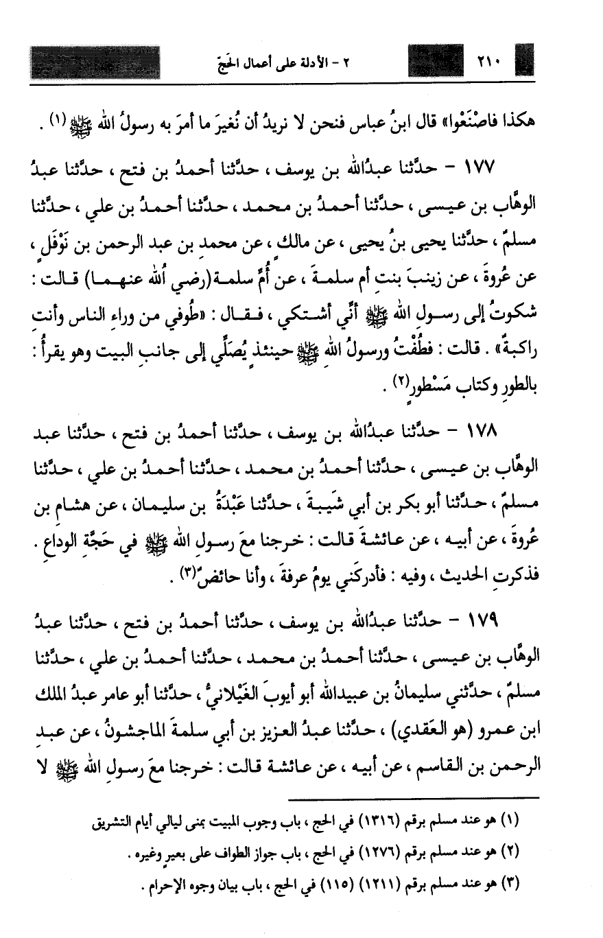 178 - حَدَّثَنَا عَبْدُ اللَّهِ بْنُ يُوسُفَ، حَدَّثَنَا أَحْمَدُ بْنُ فَتْحٍ، حَدَّثَنَا عَبْدُ الْوَهَّابِ بْنُ عِيسَى، حَدَّثَنَا أَحْمَدُ بْنُ مُحَمَّدٍ، حَدَّثَنَا أَحْمَدُ بْنُ عَلِيٍّ، حَدَّثَنَا مُسْلِمٌ، حَدَّثَنَا أَبُو بَكْرِ بْنُ أَبِي شَيْبَةَ، حَدَّثَنَا عَبْدَةُ بْنُ سُلَيْمَانَ، عَنْ هِشَامِ بْنِ عُرْوَةَ، عَنْ أَبِيهِ، عَنْ عَائِشَةَ، قَالَتْ: خَرَجْنَا مَعَ رَسُولِ اللَّهِ صَلَّى اللهُ عَلَيْهِ وَسَلَّمَ فِي حَجَّةِ الْوَدَاعِ، فَذَكَرَتِ الْحَدِيثَ، وَفِيهِ: §فَأَدْرَكَنِي يَوْمَ عَرَفَةَ وَأَنَا حَائِضٌ