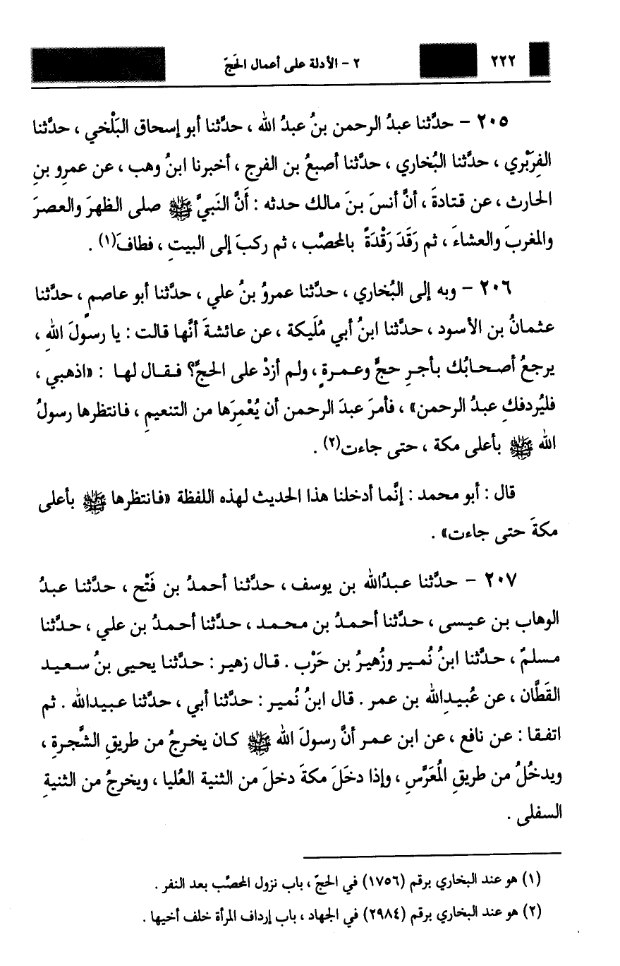 206 - وَبِهِ إِلَى الْبُخَارِيِّ: حَدَّثَنَا عَمْرُو بْنُ عَلِيٍّ، حَدَّثَنَا أَبُو عَاصِمٍ، حَدَّثَنَا عُثْمَانُ بْنُ الْأَسْوَدِ، حَدَّثَنَا ابْنُ أَبِي مُلَيْكَةَ، عَنْ عَائِشَةَ، أَنَّهَا قَالَتْ: يَا رَسُولَ اللَّهِ §يَرْجِعُ أَصْحَابُكَ بِأَجْرِ حَجٍّ وَعُمْرَةٍ وَلَمْ أَزِدْ عَلَى الْحَجِّ؟ فَقَالَ لَهَا: «اذْهَبِي فَلْيُرْدِفْكِ عَبْدُ الرَّحْمَنِ» ، فَأَمَرَ عَبْدَ الرَّحْمَنِ أَنْ يُعْمِرَهَا مِنَ التَّنْعِيمِ فَانْتَظَرَهَا رَسُولُ اللَّهِ صَلَّى اللهُ عَلَيْهِ وَسَلَّمَ بِأَعْلَى مَكَّةَ حَتَّى جَاءَتْ. قَالَ أَبُو مُحَمَّدٍ: إِنَّمَا أَدْخَلْنَا هَذَا الْحَدِيثَ لِهَذِهِ اللَّفْظَةِ: فَانْتَظَرَهَا صَلَّى اللهُ عَلَيْهِ وَسَلَّمَ بِأَعْلَى مَكَّةَ حَتَّى جَاءَتْ