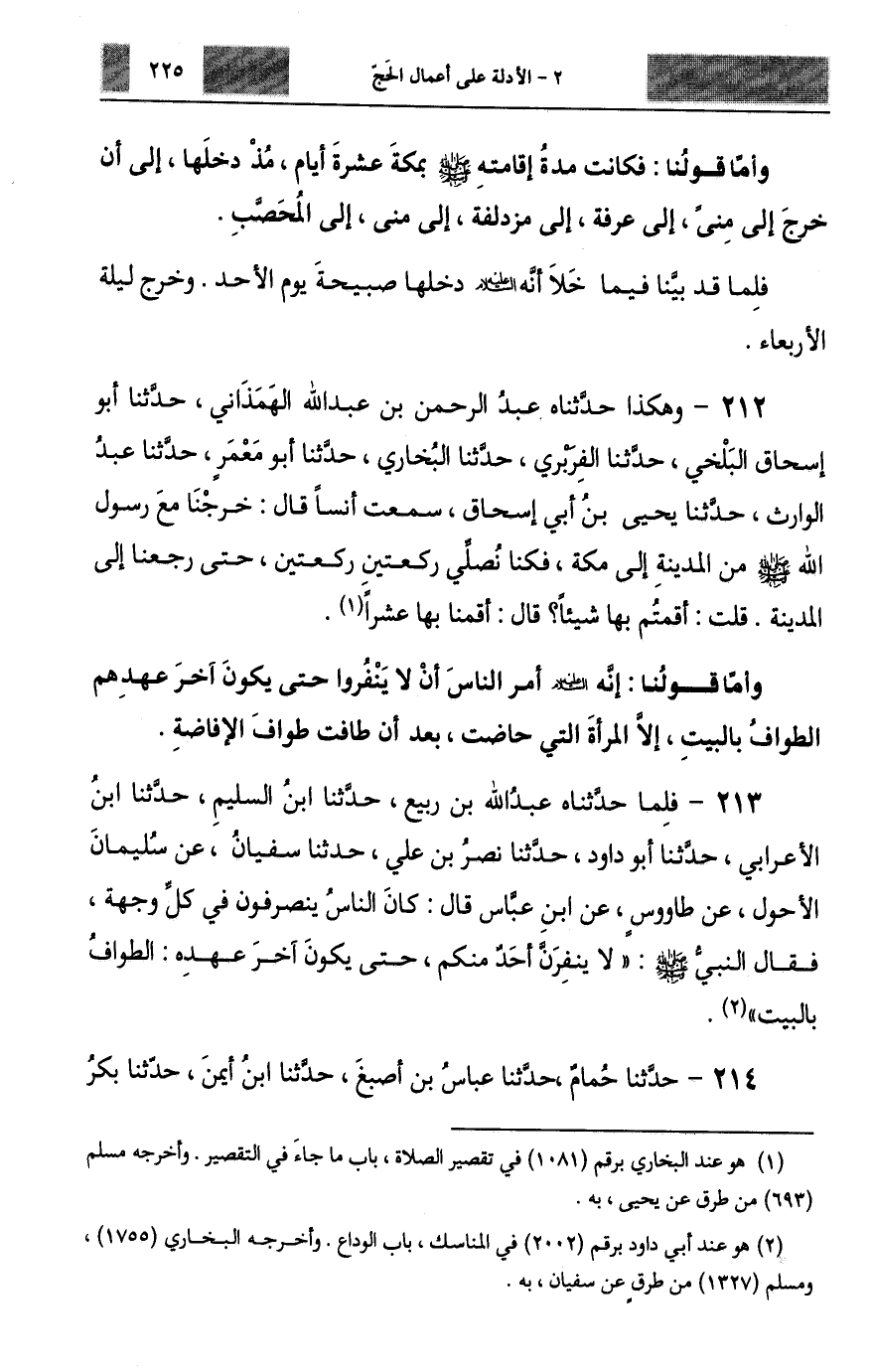 212 - وَهَكَذَا حَدَّثَنَاهُ عَبْدُ الرَّحْمَنِ بْنُ عَبْدِ اللَّهِ الْهَمَذَانِيُّ، حَدَّثَنَا أَبُو إِسْحَاقَ الْبَلْخِيُّ، حَدَّثَنَا الْفَرَبْرِيُّ، حَدَّثَنَا الْبُخَارِيُّ، حَدَّثَنَا أَبُو مَعْمَرٍ، حَدَّثَنَا عَبْدُ الْوَارِثِ، حَدَّثَنَا يَحْيَى بْنُ أَبِي إِسْحَاقَ، سَمِعْتُ أَنَسًا، قَالَ: §خَرَجْنَا مَعَ رَسُولِ اللَّهِ صَلَّى اللهُ عَلَيْهِ وَسَلَّمَ مِنَ الْمَدِينَةِ إِلَى مَكَّةَ، فَكُنَّا نُصَلِّي رَكْعَتَيْنِ رَكْعَتَيْنِ حَتَّى رَجَعْنَا إِلَى الْمَدِينَةِ، قُلْتُ: أَقَمْتُمْ بِهَا شَيْئًا؟ قَالَ: أَقَمْنَا بِهَا عَشْرًا وَأَمَّا قَوْلُنَا: إِنَّهُ عَلَيْهِ السَّلَامُ أَمَرَ النَّاسَ أَنْ لَا يَنْفِرُوا حَتَّى يَكُونَ آخِرَ عَهْدِهِمُ الطَّوَافُ بِالْبَيْتِ إِلَّا الْمَرْأَةَ الَّتِي حَاضَتْ بَعْدَ أَنْ طَافَتْ طَوَافَ الْإِفَاضَةِ