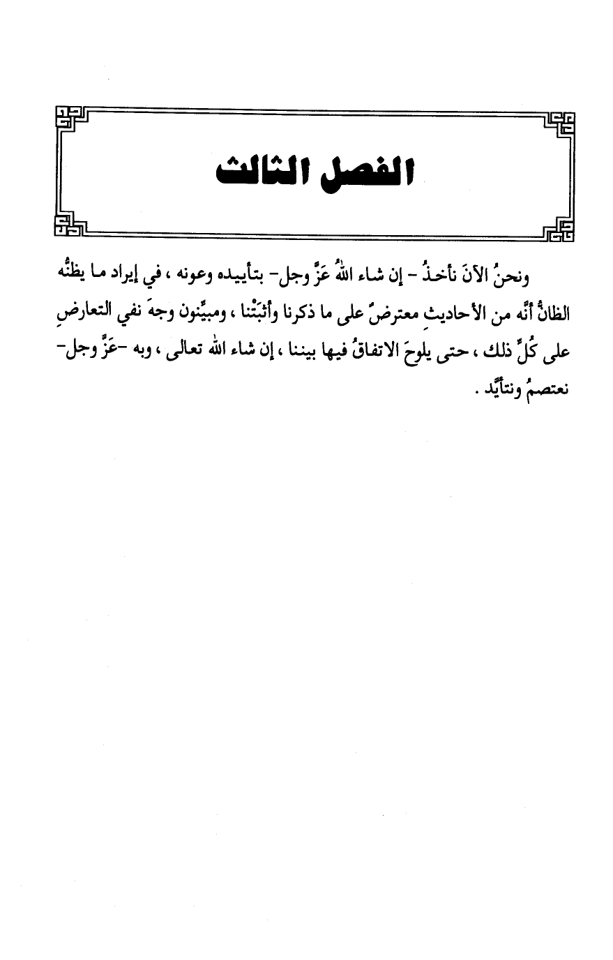 §الْفَصْلُ الثَّالِثُ وَنَحْنُ الْآنَ نَأْخُذُ إِنْ شَاءَ اللَّهُ عَزَّ وَجَلَّ بِتَأْيِيدِهِ وَعَوْنِهِ فِي إِيرَادِ مَا يَظُنُّهُ الظَّانُّ أَنَّهُ مِنَ الْأَحَادِيثِ مُعْتَرِضٌ عَلَى مَا ذَكَرْنَا وَأَثْبَتْنَا، وَمُبَيِّنُونَ وَجْهَ نَفْيِ التَّعَارُضِ عَلَى كُلِّ ذَلِكَ حَتَّى يَلُوحَ الِاتِّفَاقُ فِيهَا بَيْنَنَا إِنْ شَاءَ اللَّهُ تَعَالَى، وَبِهِ عَزَّ وَجَلَّ نَعْتَصِمُ وَنَتَأَيَّدُ