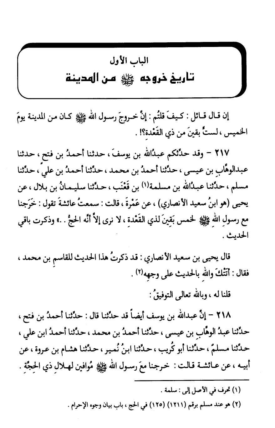 §الْبَابُ الْأَوَّلُ: تَارِيخُ خُرُوجِهِ صَلَّى اللهُ عَلَيْهِ وَسَلَّمَ مِنَ الْمَدِينَةِ إِنْ قَالَ قَائِلٌ: كَيْفَ قُلْتُمْ: إِنَّ خُرُوجَ رَسُولِ اللَّهِ صَلَّى اللهُ عَلَيْهِ وَسَلَّمَ كَانَ مِنَ الْمَدِينَةِ يَوْمَ الْخَمِيسِ لِسِتٍّ بَقِينَ مِنْ ذِي الْقَعْدَةِ؟