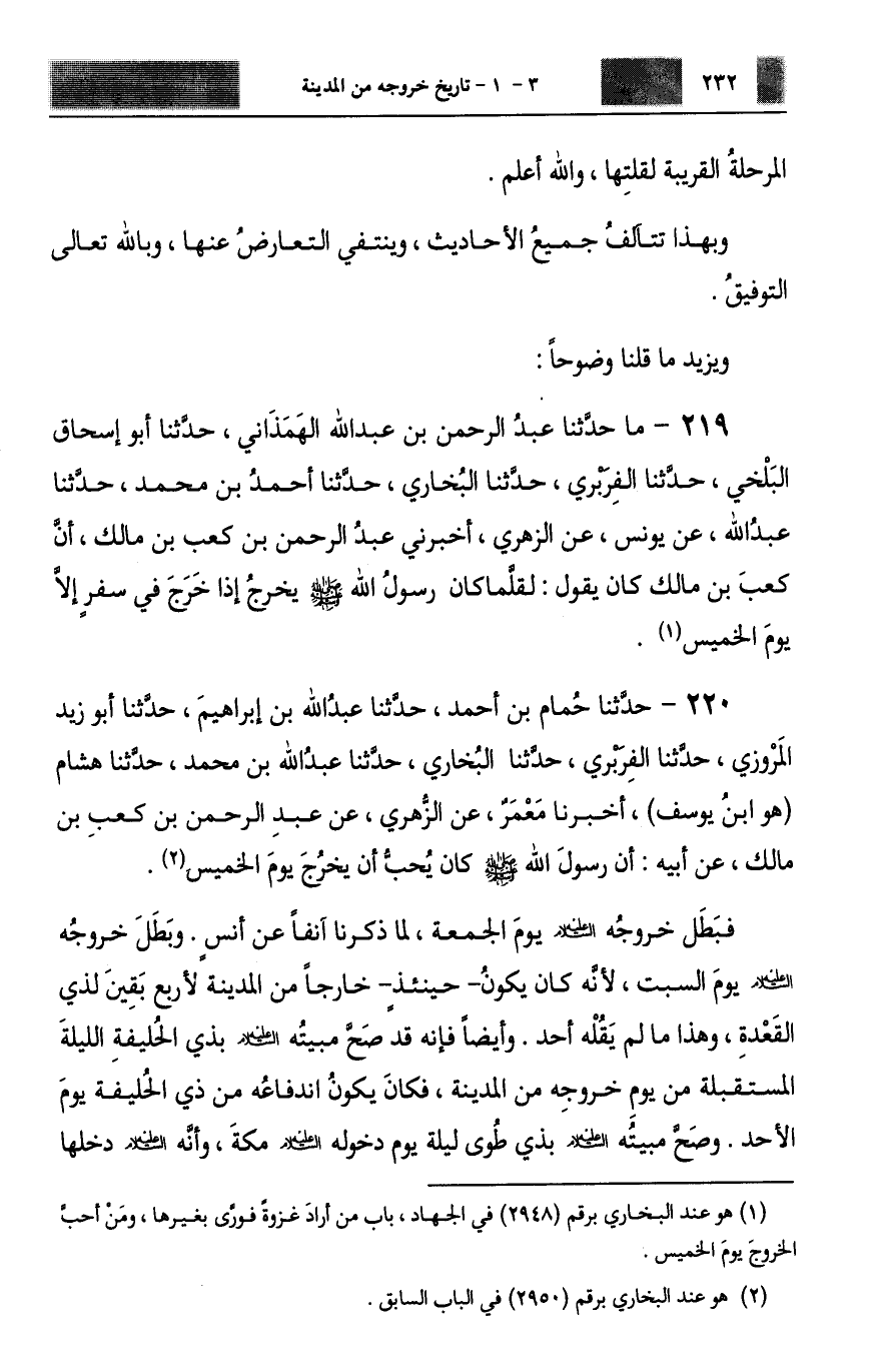 220 - حَدَّثَنَا حُمَامُ بْنُ أَحْمَدَ، حَدَّثَنَا عَبْدُ اللَّهِ بْنُ إِبْرَاهِيمَ، حَدَّثَنَا أَبُو زَيْدٍ الْمَرْوَزِيُّ، حَدَّثَنَا الْفَرَبْرِيُّ، حَدَّثَنَا الْبُخَارِيُّ، حَدَّثَنَا عَبْدُ اللَّهِ بْنُ مُحَمَّدٍ، حَدَّثَنَا هِشَامٌ هُوَ ابْنُ يُوسُفَ، أَخْبَرَنَا مَعْمَرٌ، عَنِ الزُّهْرِيِّ، عَنْ عَبْدِ الرَّحْمَنِ بْنِ كَعْبِ بْنِ مَالِكٍ، عَنْ أَبِيهِ، أَنَّ رَسُولَ اللَّهِ صَلَّى اللهُ عَلَيْهِ وَسَلَّمَ كَانَ §يُحِبُّ أَنْ يَخْرُجَ يَوْمَ الْخَمِيسِ. فَبَطَلَ خُرُوجُهُ عَلَيْهِ السَّلَامُ، يَوْمَ الْجُمُعَةِ لِمَا ذَكَرْنَا آنِفًا عَنْ أَنَسٍ، وَبَطَلَ خُرُوجُهُ عَلَيْهِ السَّلَامُ يَوْمَ السَّبْتِ؛ لِأَنَّهُ كَانَ يَكُونُ حِينَئِذٍ خَارِجًا مِنَ الْمَدِينَةِ لِأَرْبَعٍ بَقِينَ لِذِي الْقَعْدَةِ، وَهَذَا مَا لَمْ يَقُلْهُ أَحَدٌ، وَأَيْضًا فَإِنَّهُ قَدْ صَحَّ مَبِيتُهُ عَلَيْهِ السَّلَامُ بِذِي الْحُلَيْفَةِ اللَّيْلَةَ الْمُسْتَقْبَلَةَ مِنْ يَوْمِ خُرُوجِهِ مِنَ الْمَدِينَةِ، فَكَانَ يَكُونُ انْدِفَاعُهُ مِنْ ذِي الْحُلَيْفَةِ يَوْمَ الْأَحَدِ، وَصَحَّ مَبِيتُهُ عَلَيْهِ السَّلَامُ بِذِي طُوًى لَيْلَةَ يَوْمِ دُخُولِهِ عَلَيْهِ السَّلَامُ مَكَّةَ، وَأَنَّهُ عَلَيْهِ السَّلَامُ دَخَلَهَا -[233]- صَبِيحَةَ رَابِعَةٍ مِنْ ذِي الْحِجَّةِ.