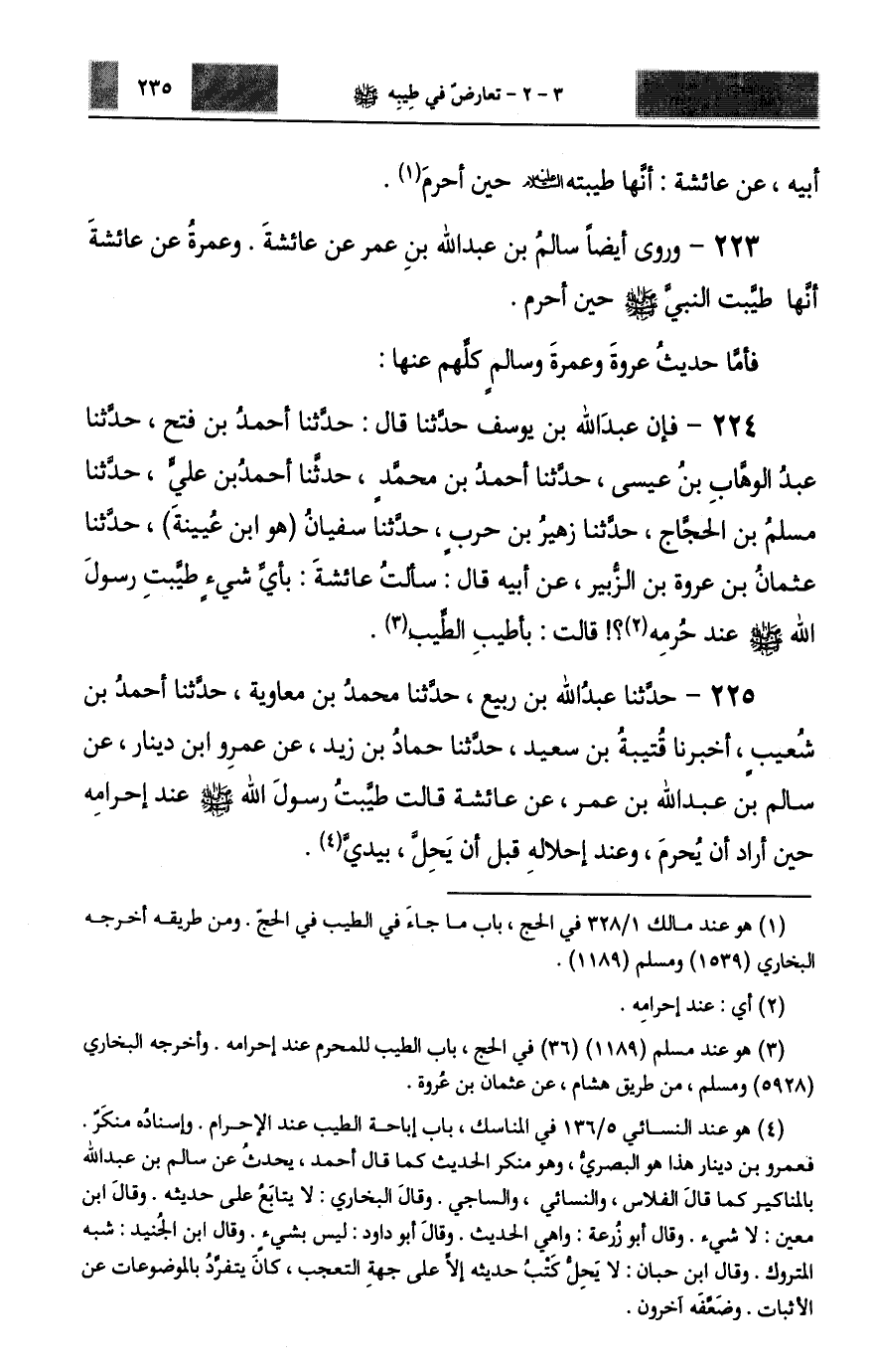 فَإِنَّ عَبْدَ اللَّهِ بْنَ يُوسُفَ حَدَّثَنَا قَالَ: حَدَّثَنَا أَحْمَدُ بْنُ فَتْحٍ، حَدَّثَنَا عَبْدُ الْوَهَّابِ بْنُ عِيسَى، حَدَّثَنَا أَحْمَدُ بْنُ مُحَمَّدٍ، حَدَّثَنَا أَحْمَدُ بْنُ عَلِيٍّ، حَدَّثَنَا مُسْلِمُ بْنُ الْحَجَّاجِ، حَدَّثَنَا زُهَيْرُ بْنُ حَرْبٍ، حَدَّثَنَا سُفْيَانُ هُوَ ابْنُ عُيَيْنَةَ، حَدَّثَنَا عُثْمَانُ بْنُ عُرْوَةَ بْنِ الزُّبَيْرِ، عَنْ أَبِيهِ، قَالَ: سَأَلْتُ عَائِشَةَ بِأَيِّ شَيْءٍ §طَيَّبْتِ رَسُولَ اللَّهِ صَلَّى اللهُ عَلَيْهِ وَسَلَّمَ عِنْدَ حُرُمِهِ؟ قَالَتْ: بِأَطْيَبِ الطِّيبِ