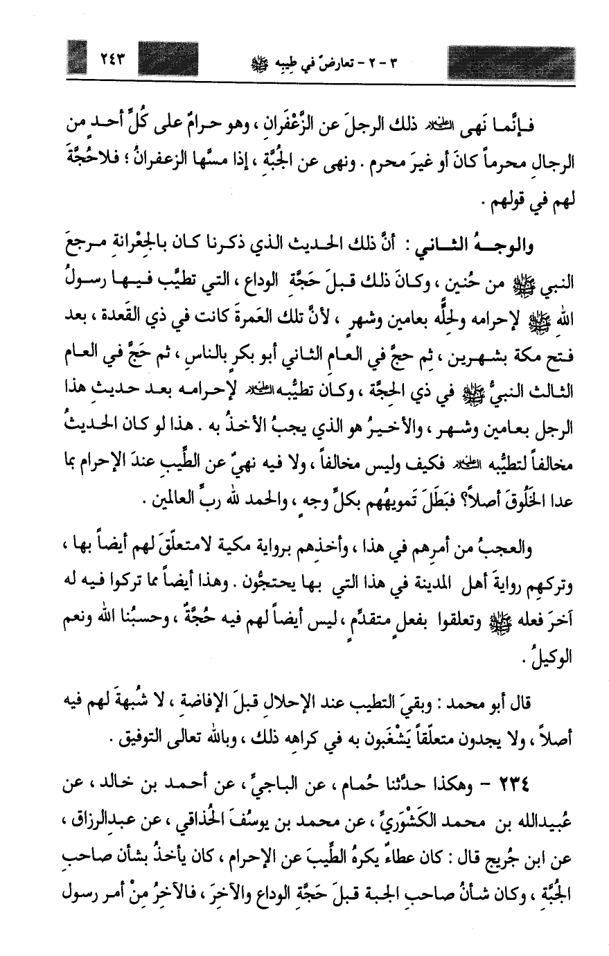 234 - وَهَكَذَا حَدَّثَنَا حُمَامٌ، عَنِ الْبَاجِيِّ، عَنْ أَحْمَدَ بْنِ خَالِدٍ، عَنْ عُبَيْدِ اللَّهِ بْنِ مُحَمَّدٍ الْكَشْوَرِيِّ، عَنْ مُحَمَّدِ بْنِ يُوسُفَ الْحُذَاقِيِّ، عَنْ عَبْدِ الرَّزَّاقِ، عَنِ ابْنِ جُرَيْجٍ، قَالَ: كَانَ عَطَاءٌ §يَكْرَهُ الطِّيبَ عِنْدَ الْإِحْرَامِ، كَانَ يَأْخُذُ بِشَأْنِ صَاحِبِ الْجُبَّةِ، وَكَانَ شَأْنُ صَاحِبِ الْجُبَّةِ قَبْلَ حَجَّةِ الْوَدَاعِ وَالْآخِرَ، فَالْآخِرُ مِنْ أَمْرِ رَسُولِ -[244]- اللَّهِ صَلَّى اللهُ عَلَيْهِ وَسَلَّمَ أَحَقُّ. هَذَا نَصُّ كَلَامِ ابْنِ جُرَيْجٍ. فَإِنْ تَعَلَّقُوا فِي كَرَاهَةِ الطِّيبِ بِمَا: