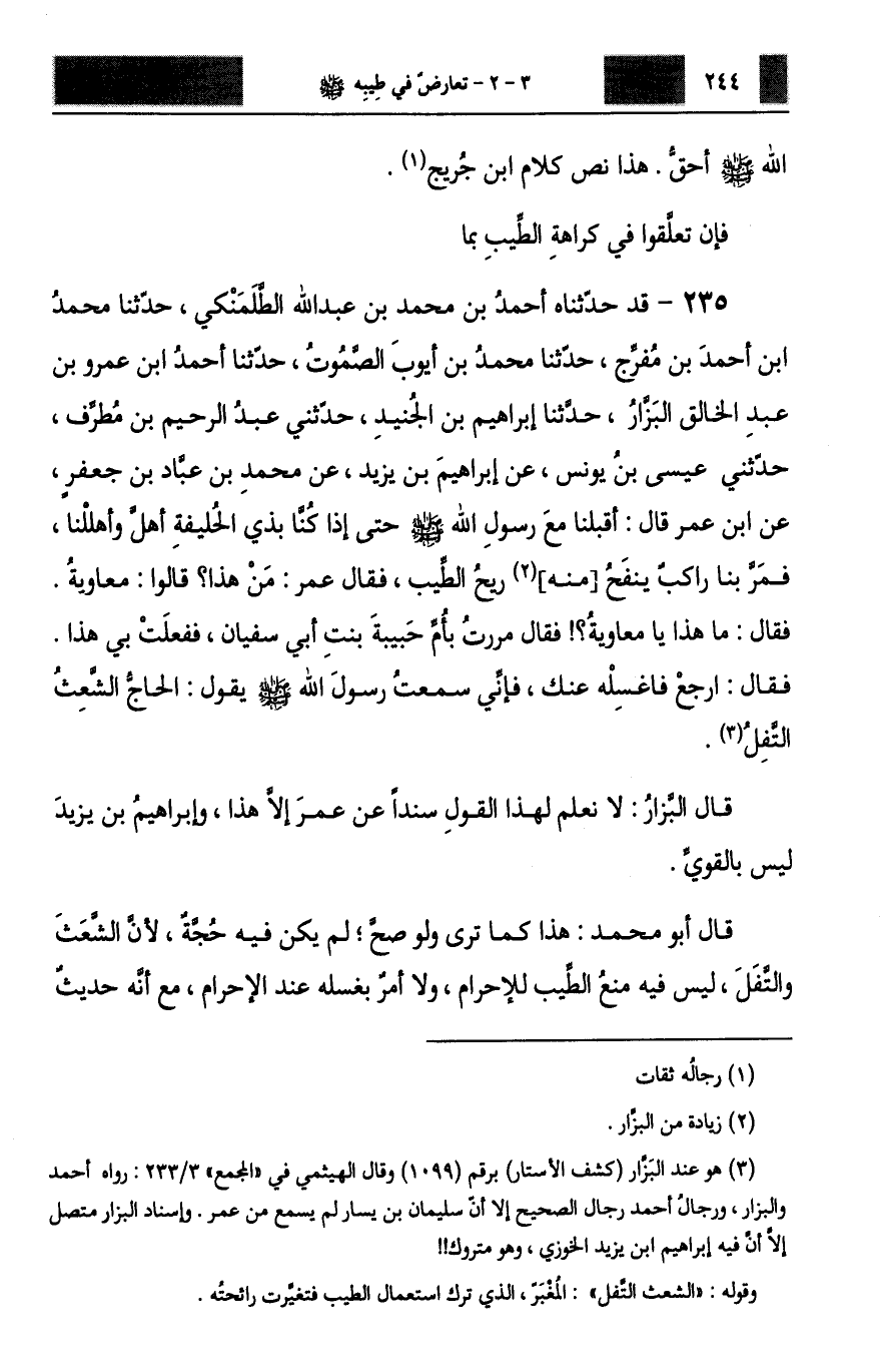 قَدْ حَدَّثَنَاهُ أَحْمَدُ بْنُ مُحَمَّدِ بْنِ عَبْدِ اللَّهِ الطَّلَمَنْكِيُّ، حَدَّثَنَا مُحَمَّدُ بْنُ أَحْمَدَ بْنِ مُفَرِّجٍ، حَدَّثَنَا مُحَمَّدُ بْنُ أَيُّوبَ الصَّمُوتُ، حَدَّثَنَا أَحْمَدُ بْنُ عَمْرِو بْنِ عَبْدِ الْخَالِقِ الْبَزَّارُ، حَدَّثَنَا إِبْرَاهِيمُ بْنُ الْجُنَيْدِ، حَدَّثَنِي عَبْدُ الرَّحِيمِ بْنُ مُطَرِّفٍ، حَدَّثَنِي عِيسَى بْنُ يُونُسَ، عَنْ إِبْرَاهِيمَ بْنِ يَزِيدَ، عَنْ مُحَمَّدِ بْنِ عَبَّادِ بْنِ جَعْفَرٍ، عَنِ ابْنِ عُمَرَ، قَالَ: أَقْبَلْنَا مَعَ رَسُولِ اللَّهِ صَلَّى اللهُ عَلَيْهِ وَسَلَّمَ حَتَّى إِذَا كُنَّا بِذِي الْحُلَيْفَةِ أَهَّلَ وَأَهْلَلْنَا، فَمَرَّ بِنَا رَاكِبٌ يَنْفَحُ مِنْهُ رِيحُ الطِّيبِ، فَقَالَ عُمَرُ: مَنْ هَذَا؟ قَالُوا: مُعَاوِيَةُ، فَقَالَ: مَا هَذَا يَا مُعَاوِيَةُ؟ فَقَالَ: مَرَرْتُ بِأُمِّ حَبِيبَةَ بِنْتِ أَبِي سُفْيَانَ فَفَعَلَتْ بِي هَذَا، فَقَالَ: ارْجِعْ فَاغْسِلْهُ عَنْكَ، فَإِنِّي سَمِعْتُ رَسُولَ اللَّهِ صَلَّى اللهُ عَلَيْهِ وَسَلَّمَ يَقُولُ: «§الْحَاجُّ الشَّعِثُ التَّفِلُ» . قَالَ الْبَزَّارُ: لَا نَعْلَمُ لِهَذَا الْقَوْلِ سَنَدًا عَنْ عُمَرَ إِلَّا هَذَا، وَإِبْرَاهِيمُ بْنُ يَزِيدَ لَيْسَ بِالْقَوِيِّ. قَالَ أَبُو مُحَمَّدٍ: هَذَا كَمَا تَرَى وَلَوْ صَحَّ لَمْ يَكُنْ فِيهِ حُجَّةٌ؛ لِأَنَّ الشَّعَثَ وَالتَّفَلَ لَيْسَ فِيهِ مَنْعُ الطِّيبِ لِلْإِحْرَامِ وَلَا أَمْرٌ بِغَسْلِهِ عِنْدَ الْإِحْرَامِ مَعَ أَنَّهُ حَدِيثٌ -[245]- فَاسِدٌ مُضْطَرِبٌ، بَيْنَمَا هُوَ فِي ذِكْرِ إِحْلَالِهِمْ مَعَ رَسُولِ اللَّهِ صَلَّى اللهُ عَلَيْهِ وَسَلَّمَ إِذْ رَجَعَ إِلَى فِعْلِ عُمَرَ فِي خِلَافَتِهِ، فَإِنْ تَعَلَّقُوا بِعُمَرَ وَرَأْيِهِ فِي ذَلِكَ وَعُثْمَانَ وَابْنِ عُمَرَ