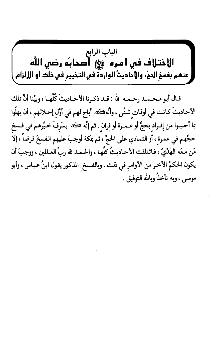 §الْبَابُ الرَّابِعُ: الِاخْتِلَافُ فِي أَمْرِهِ صَلَّى اللهُ عَلَيْهِ وَسَلَّمَ أَصْحَابَهُ رَضِيَ اللَّهُ عَنْهُمْ بِفَسْخِ الْحَجِّ، وَالْأَحَادِيثُ الْوَارِدَةُ فِي التَّخْيِيرِ فِي ذَلِكَ، أَوِ الْإِلْزَامِ قَالَ أَبُو مُحَمَّدٍ رَحِمَهُ اللَّهُ: قَدْ ذَكَرْنَا الْأَحَادِيثَ كُلَّهَا، وَبَيَّنَا أَنَّ تِلْكَ الْأَحَادِيثَ كَانَتْ فِي أَوْقَاتٍ شَتَّى، وَأَنَّهُ عَلَيْهِ الصَّلَاةُ وَالسَّلَامُ أَبَاحَ لَهُمْ فِي أَوَّلِ إِحْلَالِهِمْ أَنْ يُهِلُّوا بِمَا أَحَبُّوا مِنْ إِفْرَادٍ بِحَجٍّ أَوْ عُمْرَةٍ أَوْ قِرَانٍ، ثُمَّ إِنَّهُ عَلَيْهِ السَّلَامُ بِسَرِفَ خَيَّرَهُمْ فِي فَسْخِ حَجِّهِمْ فِي عُمْرَةٍ أَوِ التَّمَادِي عَلَى الْحَجِّ، ثُمَّ بِمَكَّةَ أَوْجَبَ عَلَيْهِمُ الْفَسْخَ فَرْضًا إَلَّا مَنْ مَعَهُ الْهَدْيُ، فَائْتَلَفَتِ الْأَحَادِيثُ كُلُّهَا، وَالْحَمْدُ لِلَّهِ رَبِّ الْعَالَمِينَ، وَوَجَبَ أَنْ يَكُونَ الْحُكْمُ الْآخَرُ مِنَ الْأَوَامِرِ فِي ذَلِكَ وَبِالْفَسْخِ الْمَذْكُورِ يَقُولُ ابْنُ عَبَّاسٍ وَأَبُو مُوسَى، وَبِهِ نأخُذُ وَبِاللَّهِ التَّوْفِيقُ