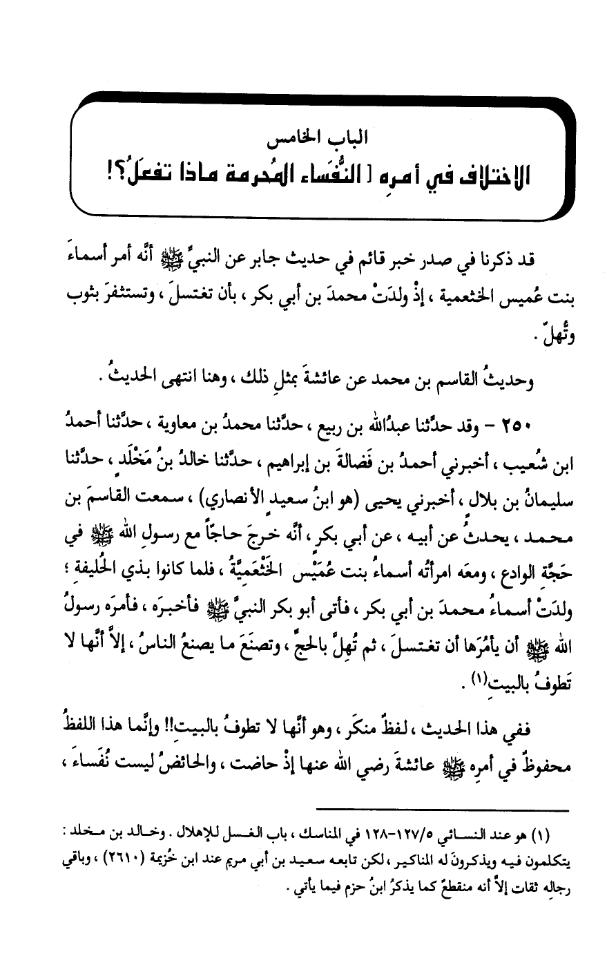 §الْبَابُ الْخَامِسُ: الِاخْتِلَافُ فِي أَمْرِهِ النُّفَسَاءَ الْمُحْرِمَةَ مَاذَا تَفْعَلُ قَدْ ذَكَرْنَا فِي صَدْرِ خَبَرٍ قَائِمٍ فِي حَدِيثِ جَابِرٍ، عَنِ النَّبِيِّ صَلَّى اللهُ عَلَيْهِ وَسَلَّمَ أَنَّهُ أَمَرَ أَسْمَاءَ بِنْتَ عُمَيْسٍ الْخَثْعَمِيَّةَ إِذْ وَلَدَتْ مُحَمَّدَ بْنَ أَبِي بَكْرٍ بِأَنْ تَغْتَسِلَ وَتَسْتَثْفِرَ بِثَوْبٍ وَتُهِلَّ، وَحَدِيثُ الْقَاسِمِ بْنِ مُحَمَّدٍ عَنْ عَائِشَةَ بِمِثْلِ ذَلِكَ، وَهُنَا انْتَهَى الْحَدِيثُ