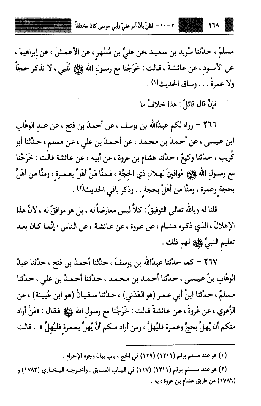 267 - كَمَا حَدَّثَنَا عَبْدُ اللَّهِ بْنُ يُوسُفَ، حَدَّثَنَا أَحْمَدُ بْنُ فَتْحٍ، حَدَّثَنَا عَبْدُ الْوَهَّابِ بْنُ عِيسَى، حَدَّثَنَا أَحْمَدُ بْنُ مُحَمَّدٍ، حَدَّثَنَا أَحْمَدُ بْنُ عَلِيٍّ، حَدَّثَنَا مُسْلِمٌ، حَدَّثَنَا ابْنُ أَبِي عُمَرَ هُوَ الْعَدَنِيُّ، حَدَّثَنَا سُفْيَانُ هُوَ ابْنُ عُيَيْنَةَ، عَنِ الزُّهْرِيِّ، عَنْ عُرْوَةَ، عَنْ عَائِشَةَ، قَالَتْ خَرَجْنَا مَعَ رَسُولِ اللَّهِ صَلَّى اللهُ عَلَيْهِ وَسَلَّمَ، فَقَالَ: «§مَنْ أَرَادَ مِنْكُمْ أَنْ يُهِلَّ بِحَجٍّ وَعُمْرَةٍ فَلْيُهِلَّ، وَمَنْ أَرَادَ مِنْكُمْ أَنْ يُهِلَّ بِعُمْرَةٍ فَلْيُهِلَّ» قَالَتْ -[269]- عَائِشَةُ: فَأَهَلَّ رَسُولُ اللَّهِ صَلَّى اللهُ عَلَيْهِ وَسَلَّمَ بِحَجٍّ، وَأَهَلَّ بِهِ نَاسٌ مَعَهُ، وَأَهَلَّ نَاسٌ بِالْعُمْرَةِ وَالْحَجِّ، وَأَهَلَّ نَاسٌ بِعُمْرَةٍ، وَكُنْتُ فِيمِنْ أَهَلَّ بِالْعُمْرَةٍ. فَصَحَّ بِهَذَا الْحَدِيثِ أَنَّ إِهْلَالَ النَّاسِ بِمَا أَهَلُّوا إِنَّمَا كَانَ بَعْدَ أَمْرِ النَّبِيِّ صَلَّى اللهُ عَلَيْهِ وَسَلَّمَ لَهُمْ بِذَلِكَ، وَاتَّفَقَ جَمِيعُ الْأَحَادِيثِ، وَالْحَمْدُ لِلَّهِ رَبِّ الْعَالَمِينَ، وَصَحَّ أَنَّ قَوْلَهَا الَّذِي ذَكَرْنَا آنِفًا إِذْ قَالَتْ: خَرَجْنَا نُلَبِّي لَا نَذْكُرُ حَجًّا وَلَا عُمْرَةً لَيْسَ مُعَارِضًا لِقَوْلِهَا، إِذْ قَالَتْ: لَبَّى قَوْمٌ بِحَجٍّ، وَقَوْمٌ بِعُمْرَةٍ، وَقَوْمٌ بِحَجٍّ وَعُمْرَةٍ، وَاسْتَبَانَ الْحَدِيثُ الَّذِي ذَكَرْنَا آنِفًا مِنْ طَرِيقِ الزُّهْرِيِّ عَنْ عُرْوَةَ، أَنَّ ذَلِكَ كَانَ وَقْتَيْنِ، فَأَوَّلُ أَمْرِهِمْ أَنْ لَبَّوْا لَا يَذْكُرُونَ حَجًّا وَلَا عُمْرَةً، ثُمَّ لَمَّا أَمَرَهُمُ النَّبِيُّ صَلَّى اللهُ عَلَيْهِ وَسَلَّمَ أَنْ يُلَبُّوا بِمَا أَحَبُّوا مِنْ ذَلِكَ لَبَّوْا، أَبَاحَ لَهُمْ وَتَآلَفَتِ الْأَحَادِيثُ بِحَمْدِ اللَّهِ تَعَالَى. فَإِنْ قَالَ قَائِلٌ: فَإِنَّكُمْ لَا تَأْخُذُونَ مِنْ هَذَا الْحَدِيثِ الَّذِي احْتَجَجْتُمْ بِهِ آنِفًا مِنْ طَرِيقِ الزُّهْرِيِّ، عَنْ عُرْوَةَ، بِمَوْضِعَيْنِ اثْنَيْنِ قُلْنَا، وَبِاللَّهِ تَعَالَى التَّوْفِيقُ،: إِنَّمَا سُقْنَاهُ لِمَا فِيهِ مِنَ النَّصِّ عَلَى أَنَّهُمْ لَمْ يُلَبُّوا بِشَيْءٍ إِلَّا حَتَّى عَلَّمَهُمْ إِيَّاهُ رَسُولُ اللَّهِ صَلَّى اللهُ عَلَيْهِ وَسَلَّمَ، ثُمَّ قُلْنَا: إِنَّ آخِرَ أَمْرِهِ عَلَيْهِ السَّلَامُ بِمَكَّةَ بِالْفَسْخِ لِمَنْ لَا هَدْيَ مَعَهُ، فَأَمَرَ مَنْ مَعَهُ الْهَدْيُ بِالْقِرَانِ، عَلَى مَا ذَكَرْنَا قَبْلُ أَنْ يَنْسَخَ الْإِبَاحَةَ الَّتِي كَانَتْ فِي هَذَا الْحَدِيثِ، وَالنَّاسِخُ هُوَ الَّذِي يَلْزَمُ الْأَخْذُ بِهِ، ثُمَّ الزَّائِدُ فِي رِوَايَتِهِ مَقْبُولٌ، وَقَدْ زَادَ اللَّيْثُ، عَنِ الزُّهْرِيِّ، عَنْ عُرْوَةَ، عَنْ عَائِشَةَ، زِيَادَةً عَلَى مَا فِي هَذَا الْحَدِيثِ الَّذِي رَوَاهُ سُفْيَانُ، عَنِ الزُّهْرِيِّ، عَنْ عُرْوَةَ، عَنْ عَائِشَةَ، فَلَزِمَ الْأَخْذُ بِهَا؛ لِأَنَّهَا زِيَادَةُ عَدْلٍ، وَهِيَ أَنَّهُ عَلَيْهِ السَّلَامُ أَهَلَّ بِالْعُمْرَةِ وَالْحَجِّ، ثُمَّ نَرْجِعُ إِلَى مَا ابْتَدَأْنَا الْكَلَامَ بِهِ مِنْ مَعْنَى إِهْلَالَهُمْ بِإِهْلَالٍ كَإِهْلَالِ -[270]- النَّبِيِّ صَلَّى اللهُ عَلَيْهِ وَسَلَّمَ مُطْلَقًا، فَنَقُولُ وَبِاللَّهِ التَّوْفِيقُ: فَهَذِهِ عَائِشَةُ قَدْ ذَكَرَتْ أَنَّهُمْ لَبَّوْا بِغَيْرِ ذِكْرِ حَجٍّ وَلَا عُمْرَةٍ، حَتَّى عَلَّمَهُمُ النَّبِيُّ صَلَّى اللهُ عَلَيْهِ وَسَلَّمَ