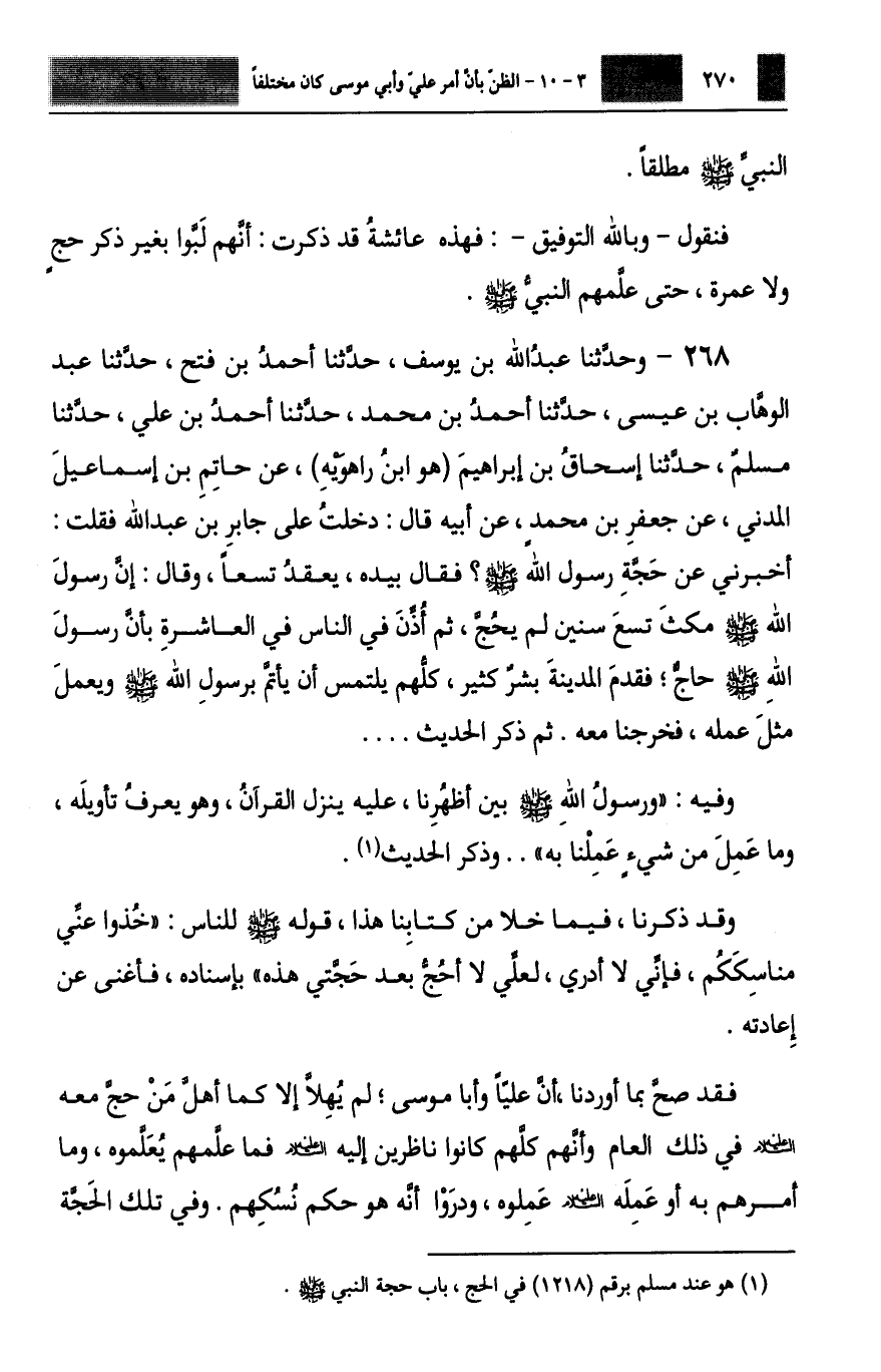 268 - وَحَدَّثَنَا عَبْدُ اللَّهِ بْنُ يُوسُفَ، حَدَّثَنَا أَحْمَدُ بْنُ فَتْحٍ، حَدَّثَنَا عَبْدُ الْوَهَّابِ بْنُ عِيسَى، حَدَّثَنَا أَحْمَدُ بْنُ مُحَمَّدٍ، حَدَّثَنَا أَحْمَدُ بْنُ عَلِيٍّ، حَدَّثَنَا مُسْلِمٌ، حَدَّثَنَا إِسْحَاقُ بْنُ إِبْرَاهِيمَ، هُوَ ابْنُ رَاهَوَيْهِ، عَنْ حَاتِمِ بْنِ إِسْمَاعِيلَ الْمَدَنِيِّ، عَنْ جَعْفَرِ بْنِ مُحَمَّدٍ، عَنْ أَبِيهِ، قَالَ: دَخَلْتُ عَلَى جَابِرِ بْنِ عَبْدِ اللَّهِ، فَقُلْتُ: أَخْبِرْنِي عَنْ حَجَّةِ، رَسُولِ اللَّهِ صَلَّى اللهُ عَلَيْهِ وَسَلَّمَ، فَقَالَ بِيَدِهِ، يَعْقِدُ تِسْعًا، وَقَالَ: إِنَّ رَسُولَ اللَّهِ صَلَّى اللهُ عَلَيْهِ وَسَلَّمَ §مَكَثَ تِسْعَ سِنِينَ لَمْ يَحُجَّ، ثُمَّ أُذِّنَ فِي النَّاسِ فِي الْعَاشِرَةِ، بِأَنَّ رَسُولَ اللَّهِ صَلَّى اللهُ عَلَيْهِ وَسَلَّمَ حَاجٌّ، فَقَدِمَ الْمَدِينَةَ بَشَرٌ كَثِيرٌ، كُلُّهُمْ يَلْتَمِسُ أَنْ يَأْتَمَّ بِرَسُولِ اللَّهِ صَلَّى اللهُ عَلَيْهِ وَسَلَّمَ، وَيَعْمَلَ مِثْلَ عَمَلِهِ، فَخَرَجْنَا مَعَهُ، ثُمَّ ذَكَرَ الْحَدِيثَ. وَفِيهِ: وَرَسُولُ اللَّهِ صَلَّى اللهُ عَلَيْهِ وَسَلَّمَ بَيْنَ أَظْهُرِنَا، عَلَيْهِ يَنْزِلُ الْقُرْآنُ، وَهُوَ يَعْرِفُ تَأْوِيلَهُ، وَمَا عَمِلَ مِنْ شَيْءٍ عَمِلْنَا بِهِ، وَذَكَرَ الْحَدِيثَ. وَقَدْ ذَكَرْنَا فِيمَا خَلَا مِنْ كِتَابِنَا هَذَا قَوْلَهُ صَلَّى اللهُ عَلَيْهِ وَسَلَّمَ لِلنَّاسِ: «خُذُوا عَنِّي مَنَاسِكَكُمْ، فَإِنِّي لَا أَدْرِي لَعَلِّي لَا أَحُجُّ بَعْدَ حَجَّتِي هَذِهِ» بِإِسْنَادِهِ، فَأَغْنَى عَنْ إِعَادَتِهِ. فَقَدْ صَحَّ بِمَا أَوْرَدْنَا أَنَّ عَلِيًّا وَأَبَا مُوسَى لَمْ يُهِلَّا، إِلَّا كَمَا أَهَلَّ مَنْ حَجَّ مَعَهُ عَلَيْهِ السَّلَامُ فِي ذَلِكَ الْعَامِ، وَأَنَّهُمْ كُلُّهُمْ كَانُوا نَاظِرِينَ إِلَيْهِ عَلَيْهِ السَّلَامُ، فَمَا عَلَّمَهُمْ يُعَلَّمُوهُ، وَمَا أَمَرَهُمْ بِهِ أَوْ عَمِلَهُ عَلَيْهِ السَّلَامُ عَمِلُوهُ، وَدَرَوْا أَنَّهُ هُوَ حُكْمُ نُسُكِهِمْ، وَفِي تِلْكَ الْحَجَّةِ -[271]- اسْتَقَرَّ حُكْمُ الْحَجِّ وَالْعُمْرَةِ وَجَمِيعِ الْمَنَاسِكِ، فَلَيْسَ لِأَحَدٍ بَعْدَ هَذَا أَنْ يَتَعَدَّى مَا أَمَرَ بِهِ اللَّهُ تَعَالَى عَلَى لِسَانِ نَبِيِّهِ صَلَّى اللهُ عَلَيْهِ وَسَلَّمَ فِيهَا، لَا فِي إِهْلَالٍ وَلَا فِي غَيْرِهِ بِوَجْهٍ مِنَ الْوُجُوهِ وَبِاللَّهِ تَعَالَى التَّوْفِيقُ، وَقَدْ بَيَّنَّا كُلَّ مَا عَمِلَ بِهِ عَلَيْهِ السَّلَامُ فِي تِلْكَ الْحَجَّةِ، وَمَا بَلَغَنَا أَنَّهُ أَمَرَ بِهِ فِيهَا وَإِنْ كُنَّا قَدْ تَرَكْنَا لَهُ عَلَيْهِ السَّلَامُ أُوَامِرَ فِي الْمَنَاسِكِ كَثِيرَةً؛ لِأَنَّا لَمْ نَجِدْ نَصًّا عَلَى أَنَّهُ عَلَيْهِ السَّلَامُ أَمَرَ بِهَا فِي تِلْكَ الْحَجَّةِ، وَإِنَّمَا قَصَدْنَا تِلْكَ الْحَجَّةِ، وَمَا صَحَّ عِنْدَنَا أَنَّهُ كَانَ فِيهَا مِنْ أَمْرٍ أَوْ عَمَلٍ، وَبِاللَّهِ تَعَالَى التَّوْفِيقُ
