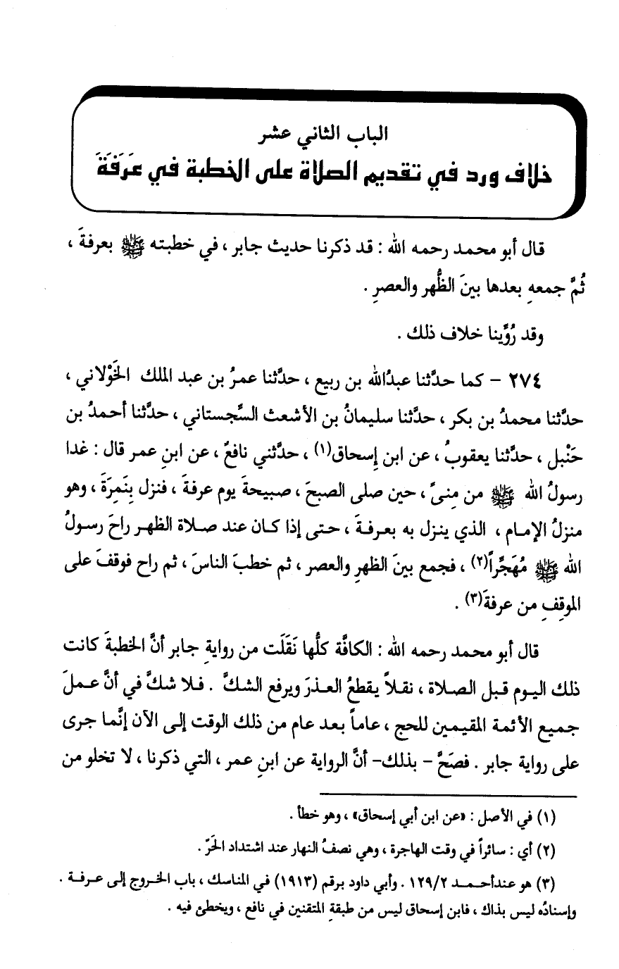 274 - كَمَا حَدَّثَنَا عَبْدُ اللَّهِ بْنُ رَبِيعٍ، حَدَّثَنَا عُمَرُ بْنُ عَبْدِ الْمَلِكِ الْخَوْلَانِيُّ، حَدَّثَنَا مُحَمَّدُ بْنُ بَكْرٍ، حَدَّثَنَا سُلَيْمَانُ بْنُ الْأَشْعَثِ السِّجِسْتَانِيُّ، حَدَّثَنَا أَحْمَدُ بْنُ حَنْبَلٍ، حَدَّثَنَا يَعْقُوبُ، عَنِ ابْنِ إِسْحَاقَ، حَدَّثَنِي نَافِعٌ، عَنِ ابْنِ عُمَرَ، قَالَ: §غَدَا رَسُولُ اللَّهِ صَلَّى اللهُ عَلَيْهِ وَسَلَّمَ مِنْ مِنًى حِينَ صَلَّى الصُّبْحَ صَبِيحَةَ يَوْمِ عَرَفَةَ، فَنَزَلَ بِنَمِرَةَ، وَهُوَ مَنْزِلُ الْإِمَامِ الَّذِي يَنْزِلُ بِهِ بِعَرَفَةَ، حَتَّى إِذَا كَانَ عِنْدَ صَلَاةِ الظُّهْرِ رَاحَ رَسُولُ اللَّهِ صَلَّى اللهُ عَلَيْهِ وَسَلَّمَ مُهَجِّرًا، فَجَمَعَ بَيْنَ الظُّهْرِ وَالْعَصْرِ، ثُمَّ خَطَبَ النَّاسَ، ثُمَّ رَاحَ فَوَقَفَ عَلَى الْمَوْقِفِ مِنْ عَرَفَةَ، قَالَ أَبُو مُحَمَّدٍ رَحِمَهُ اللَّهُ: الْكَافَّةُ كُلُّهَا نَقَلَتْ مِنْ رِوَايَةِ جَابِرٍ أَنَّ الْخُطْبَةَ كَانَتْ ذَلِكَ الْيَوْمَ قَبْلَ الصَّلَاةِ نَقْلًا يَقْطَعُ الْعُذْرَ وَيَرْفَعُ الشَّكَّ، فَلَا شَكَّ فِي أَنَّ عَمَلَ جَمِيعِ الْأَئِمَّةِ الْمُقِيمِينَ لِلْحَجِّ عَامًا بَعْدَ عَامٍ، مِنْ ذَلِكَ الْوَقْتِ إِلَى الْآنَ، إِنَّمَا جَرَى عَلَى رِوَايَةِ جَابِرٍ، فَصَحَّ بِذَلِكَ أَنَّ الرِّوَايَةَ عَنِ ابْنِ عُمَرَ الَّتِي ذَكَرْنَا لَا تَخْلُو مِنْ -[278]- أَحَدِ وَجْهَيْنِ لَا ثَالِثَ لَهُمَا، إِمَّا أَنْ يَكُونَ النَّبِيُّ صَلَّى اللهُ عَلَيْهِ وَسَلَّمَ خَطَبَ كَمَا رَوَى جَابِرٌ ثُمَّ جَمَعَ بَيْنَ الصَّلَاتَيْنِ، ثُمَّ كَلَّمَ صَلَّى اللهُ عَلَيْهِ وَسَلَّمَ النَّاسَ بِبَعْضِ مَا يَأْمُرُهُمْ بِهِ، وَيَعِظُهُمْ فِيهِ، فَسَمَّى ذَلِكَ الْيَوْمَ خُطْبَةً، فَيَتَّفِقُ الْحَدِيثَانِ بِذَلِكَ، وَهَذَا حَسَنٌ لِمَنْ فَعَلَهُ، فَإِنْ لَمْ يَكُنْ هَذَا، فَحَدِيثُ ابْنِ عُمَرَ، وَاللَّهُ أَعْلَمُ، وَهْمٌ بَيْنَ أَحْمَدَ بْنِ حَنْبَلٍ، وَبَيْنَ نَافِعٍ، وَاللَّهُ أَعْلَمُ